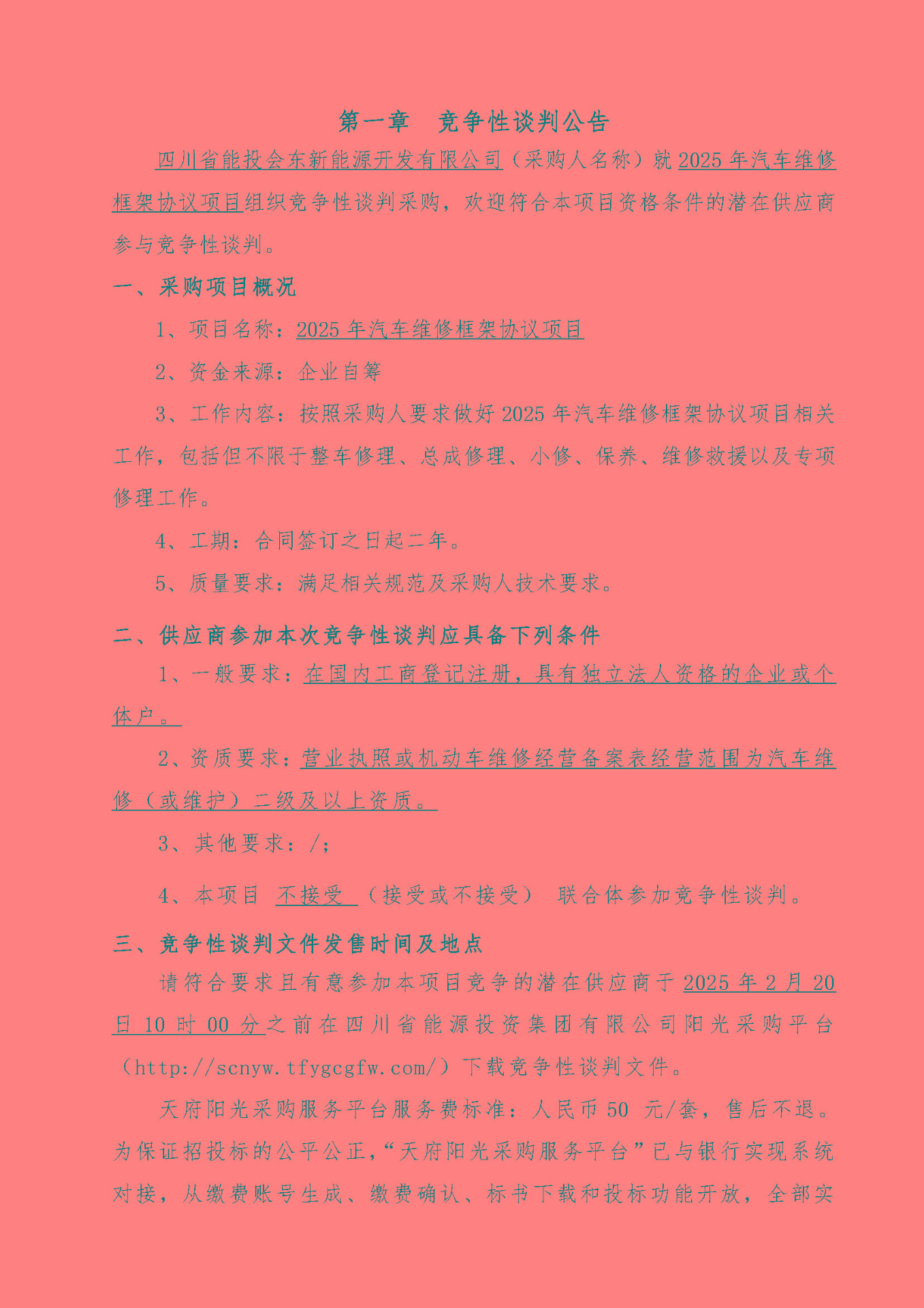 四川省能投会东新能源开发有限公司(采购人名称)就2025年汽车维修框架协议项目组织竞争性谈判采购,欢迎符合本项目资格条件的潜在供应商参与竞争性谈判。