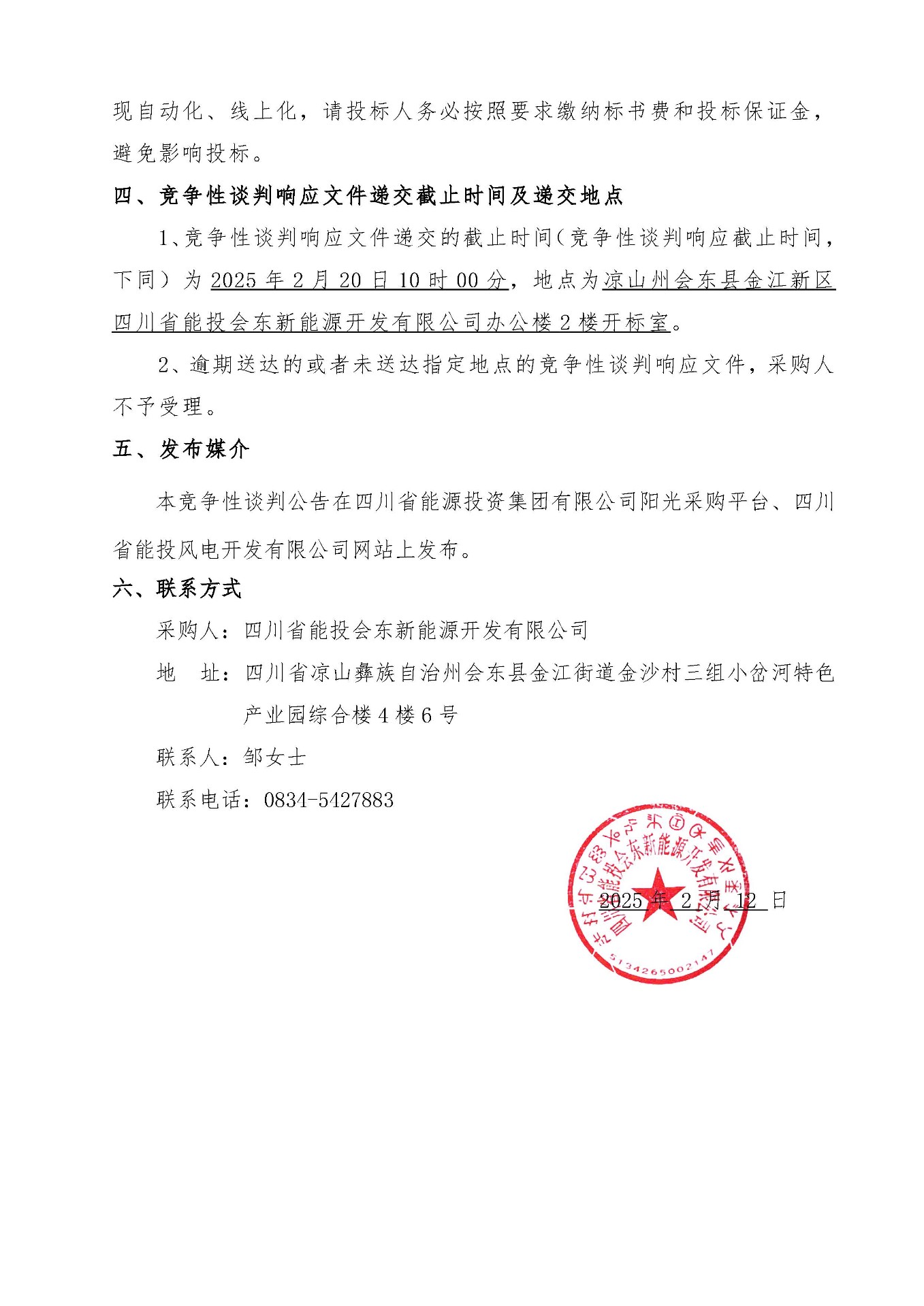1、竞争性谈判响应文件递交的截止时间(竞争性谈判响应截止时间,下同)为2025年2月20日10时00分,地点为凉山州会东县金江新区四川省能投会东新能源开发有限公司办公楼2楼开标室。