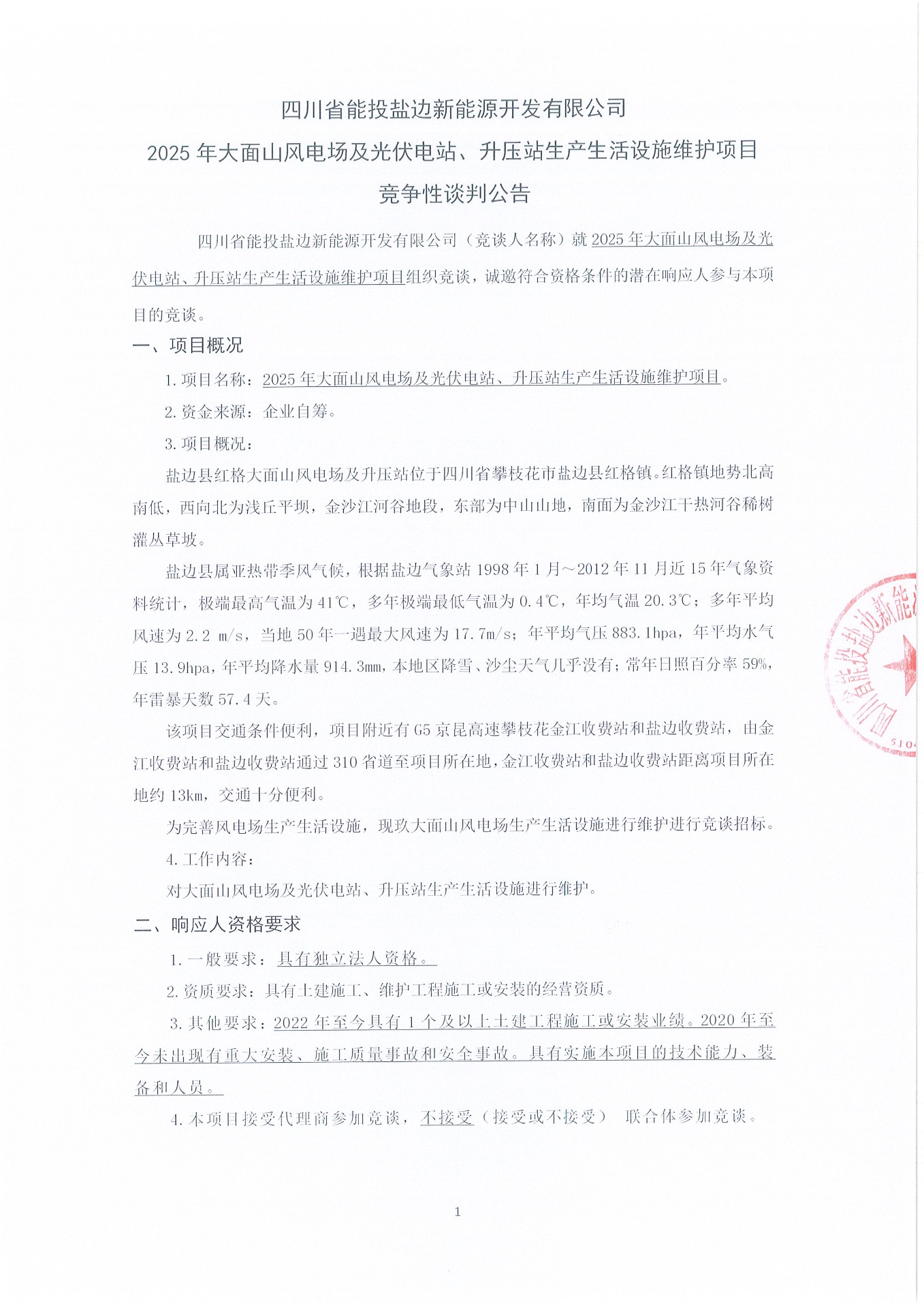 四川省能投盐边新能源开发有限公司(竞谈人名称)就2025年大面山风电场及光伏电站、升压站生产生活设施维护项目组织竞谈,诚邀符合资格条件的潜在响应人参与本项目的竞谈。
