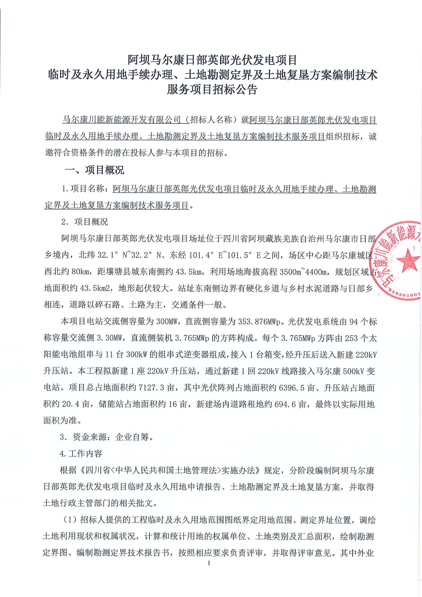 1.项目名称:阿坝马尔康日部英郎光伏发电项目临时及永久用地手续办理、土地勘测定界及土地复垦方案编制技术服务项目。