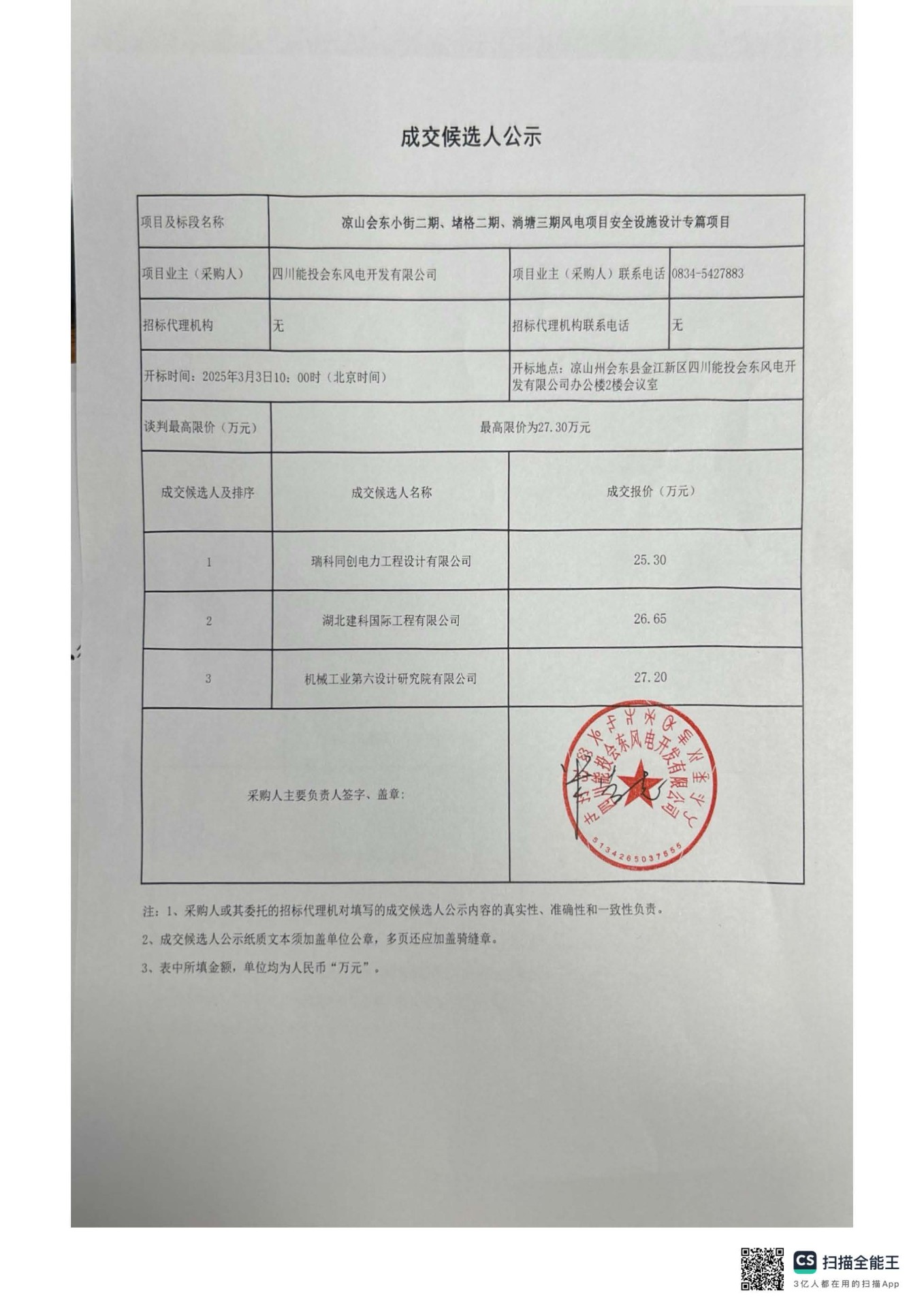 四川能投会东风电开发有限公司关于凉山会东小街二期、堵格二期、淌塘三期风电项目安全设施设计专篇项目的成交候选人公示