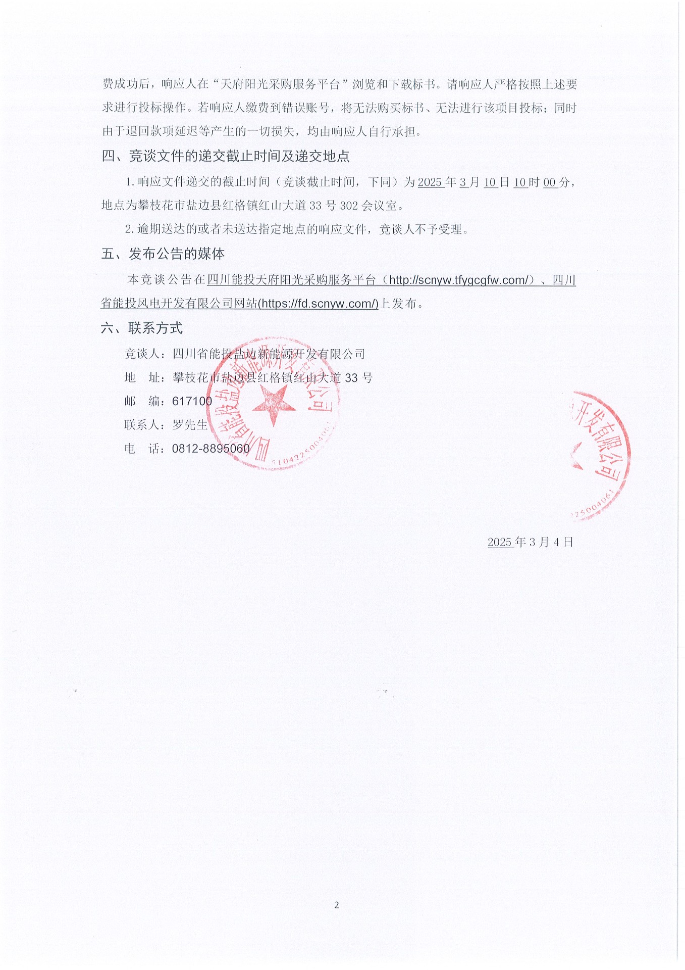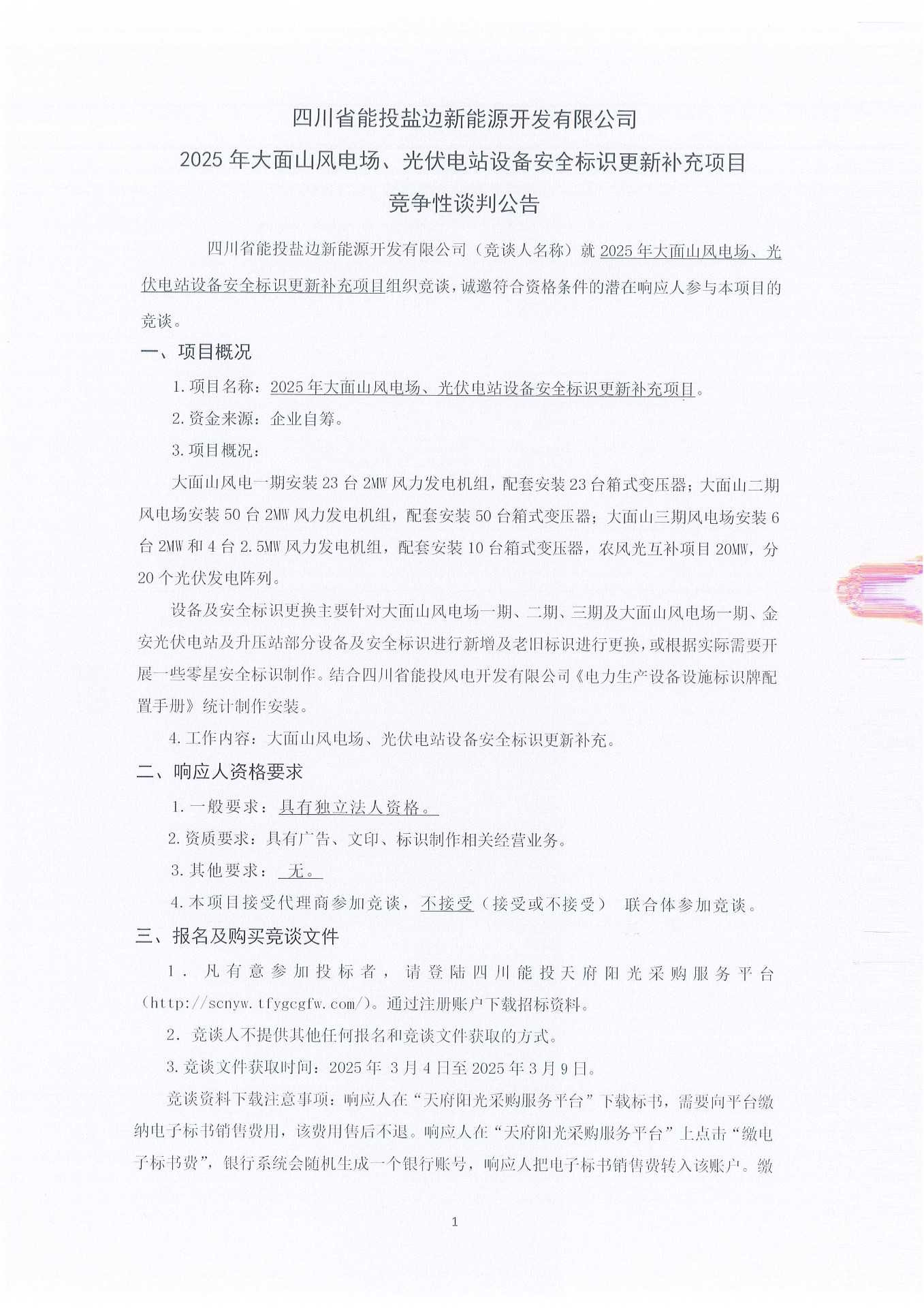 四川省能投盐边新能源开发有限公司(竞谈人名称)就2025年大面山风电场、光伏电站设备安全标识更新补充项目组织竞谈,诚邀符合资格条件的潜在响应人参与本项目的竞谈。