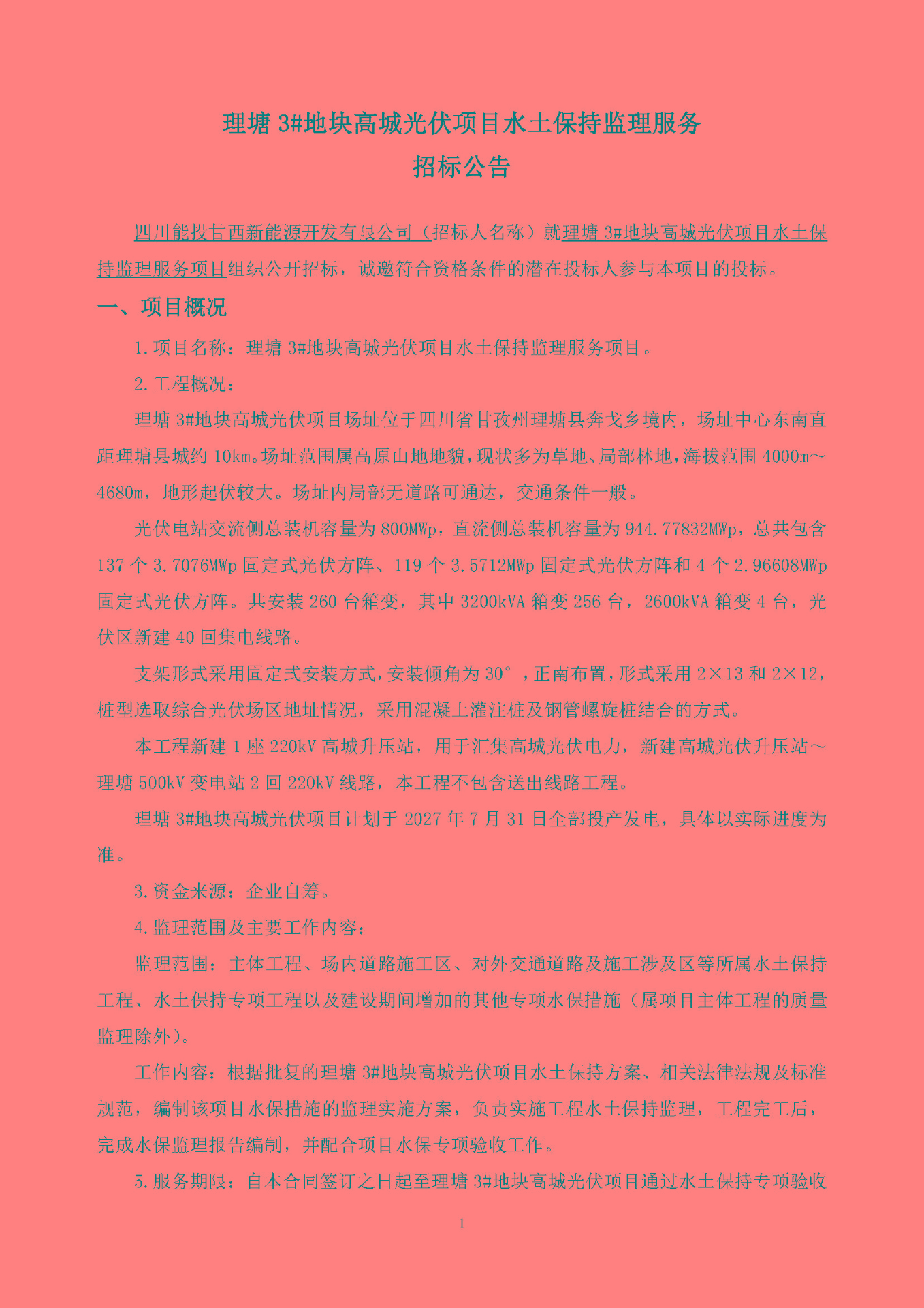 1.项目名称:理塘3#地块高城光伏项目水土保持监理服务项目。