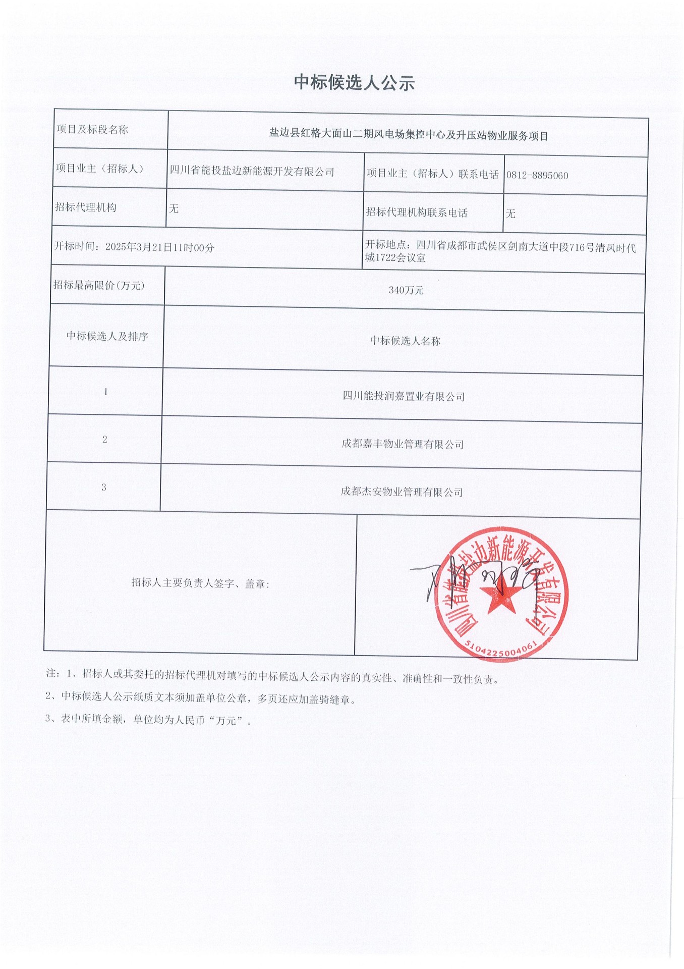 四川省能投盐边新能源开发有限公司关于盐边县红格大面山二期风电场集控中心及升压站物业服务项目的中标候选人公示