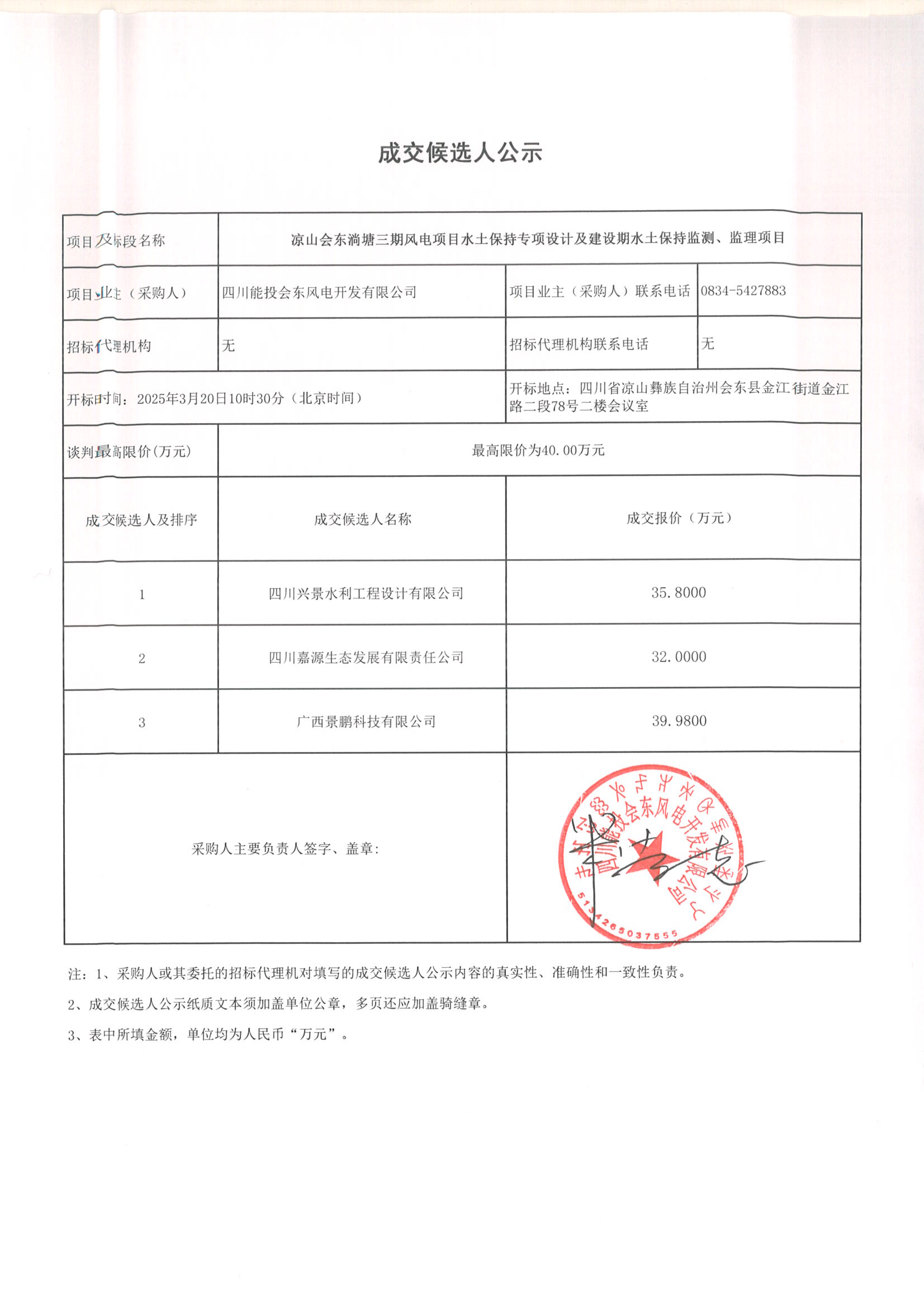 四川能投会东风电开发有限公司关于凉山会东淌塘三期风电项目水土保持专项设计及建设期水土保持监测、监理项目的成交候选人公示