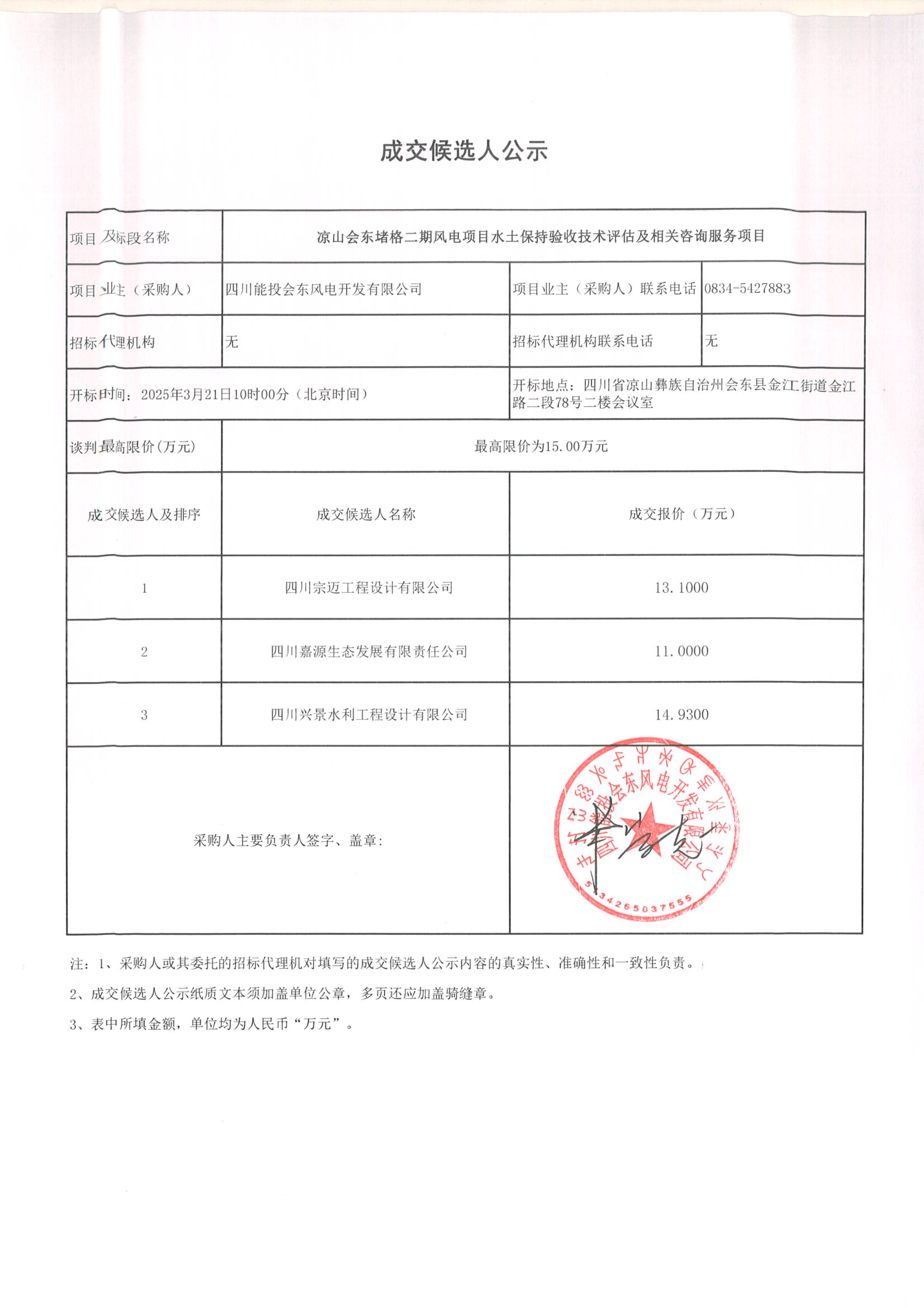 四川能投会东风电开发有限公司关于凉山会东堵格二期风电项目水土保持验收技术评估及相关咨询服务项目的成交候选人公示