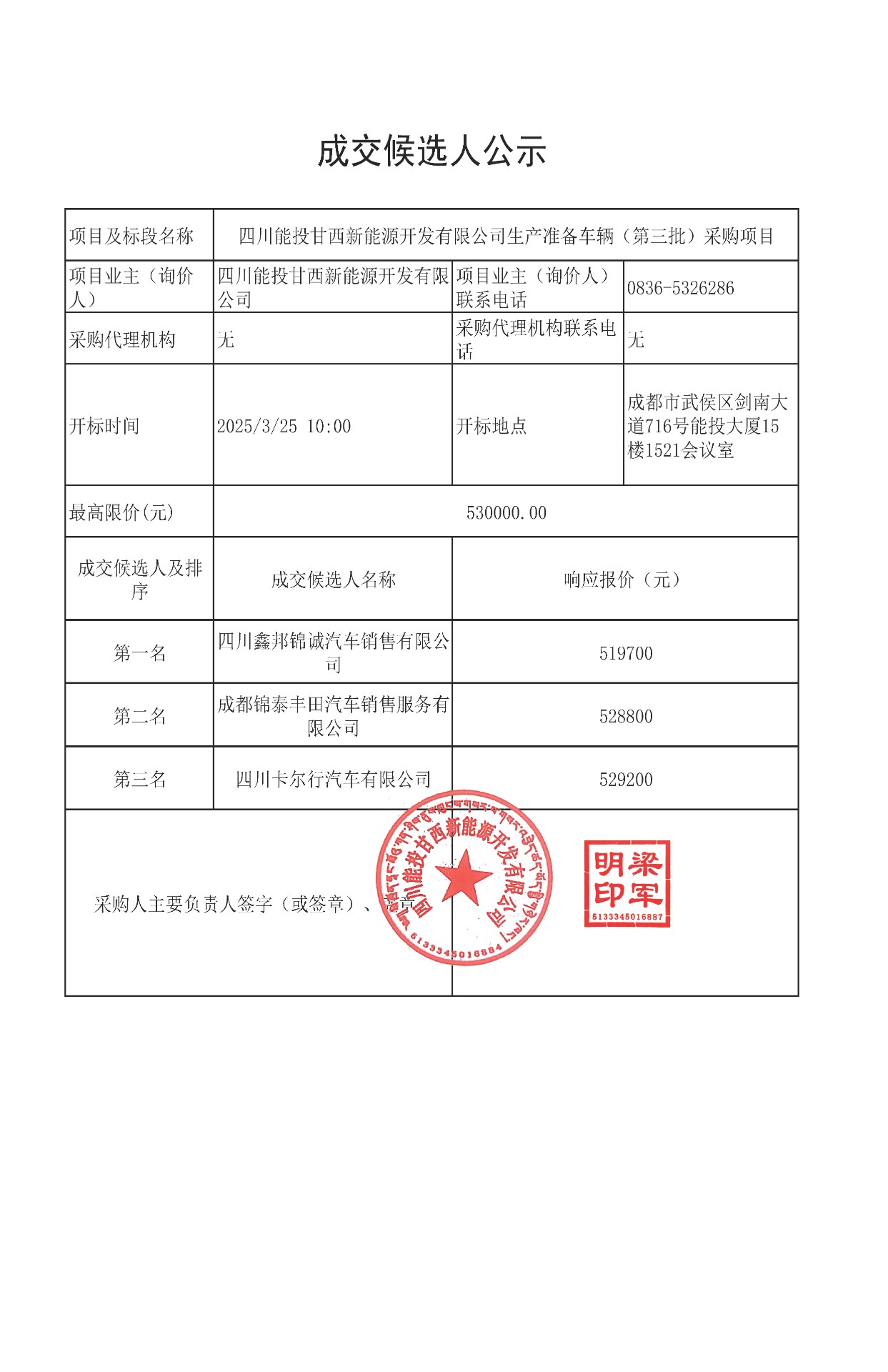 四川能投甘西新能源开发有限公司关于生产准备车辆(第三批)采购项目的成交候选人公示