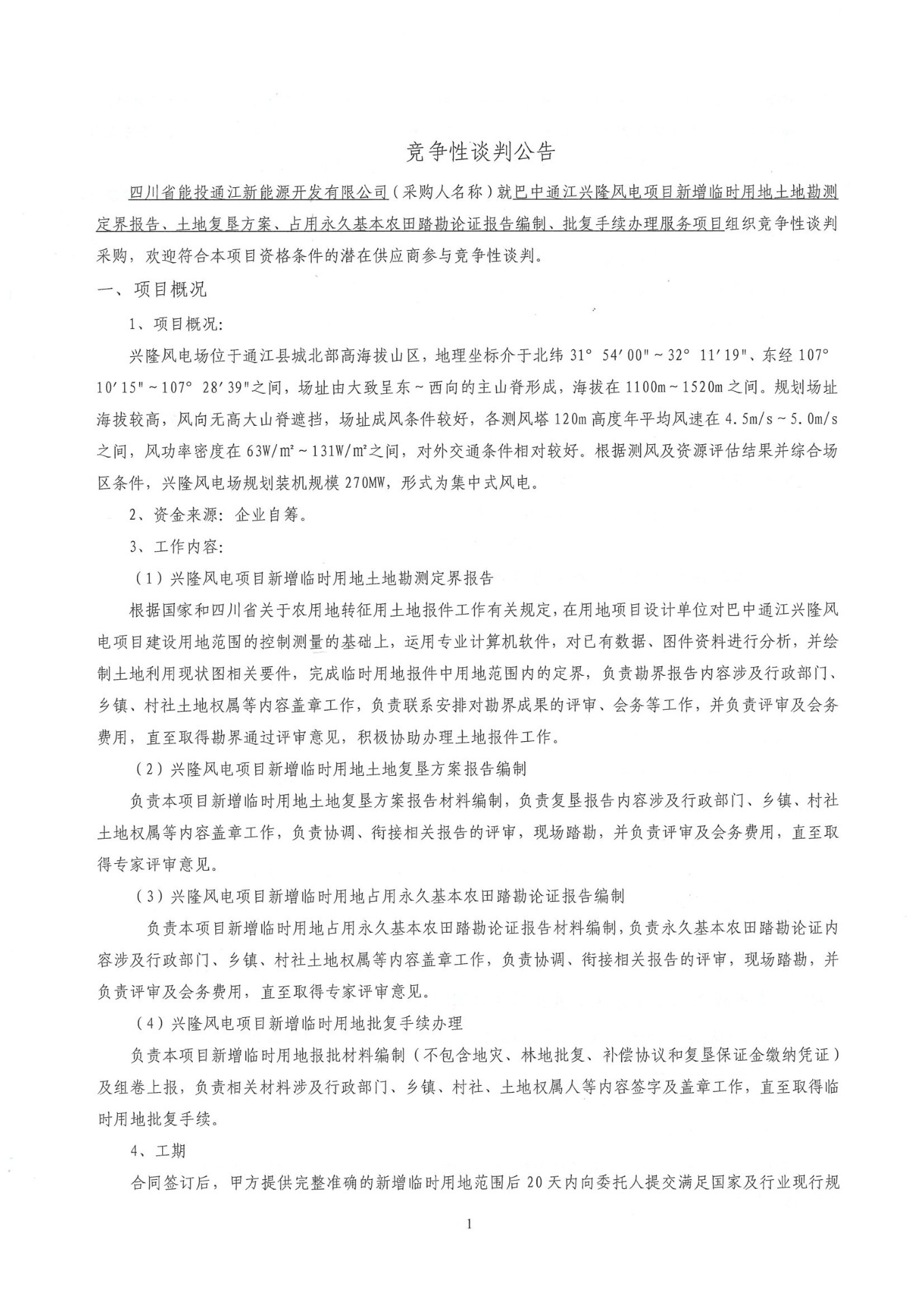 四川省能投通江新能源开发有限公司(采购人名称)就巴中通江兴隆风电项目新增临时用地土地勘测定界报告、土地复垦方案、占用永久基本农田踏勘论证报告编制、批复手续办理服务项目组织竞争性谈判采购,欢迎符合本项目资格条件的潜在供应商参与竞争性谈判。