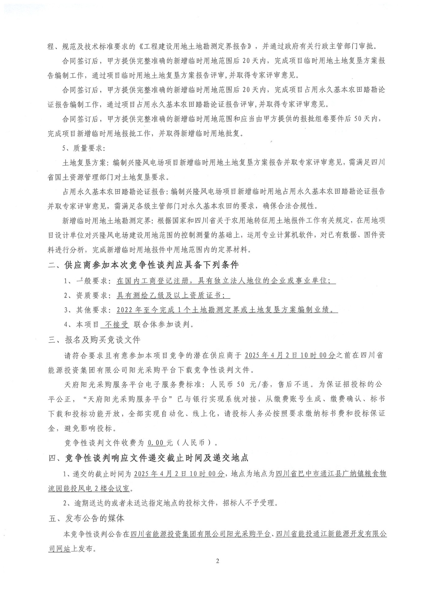 请符合要求且有意参加本项目竞争的潜在供应商于2025年4月2日10时00分之前在四川省能源投资集团有限公司阳光采购平台下载竞争性谈判文件。