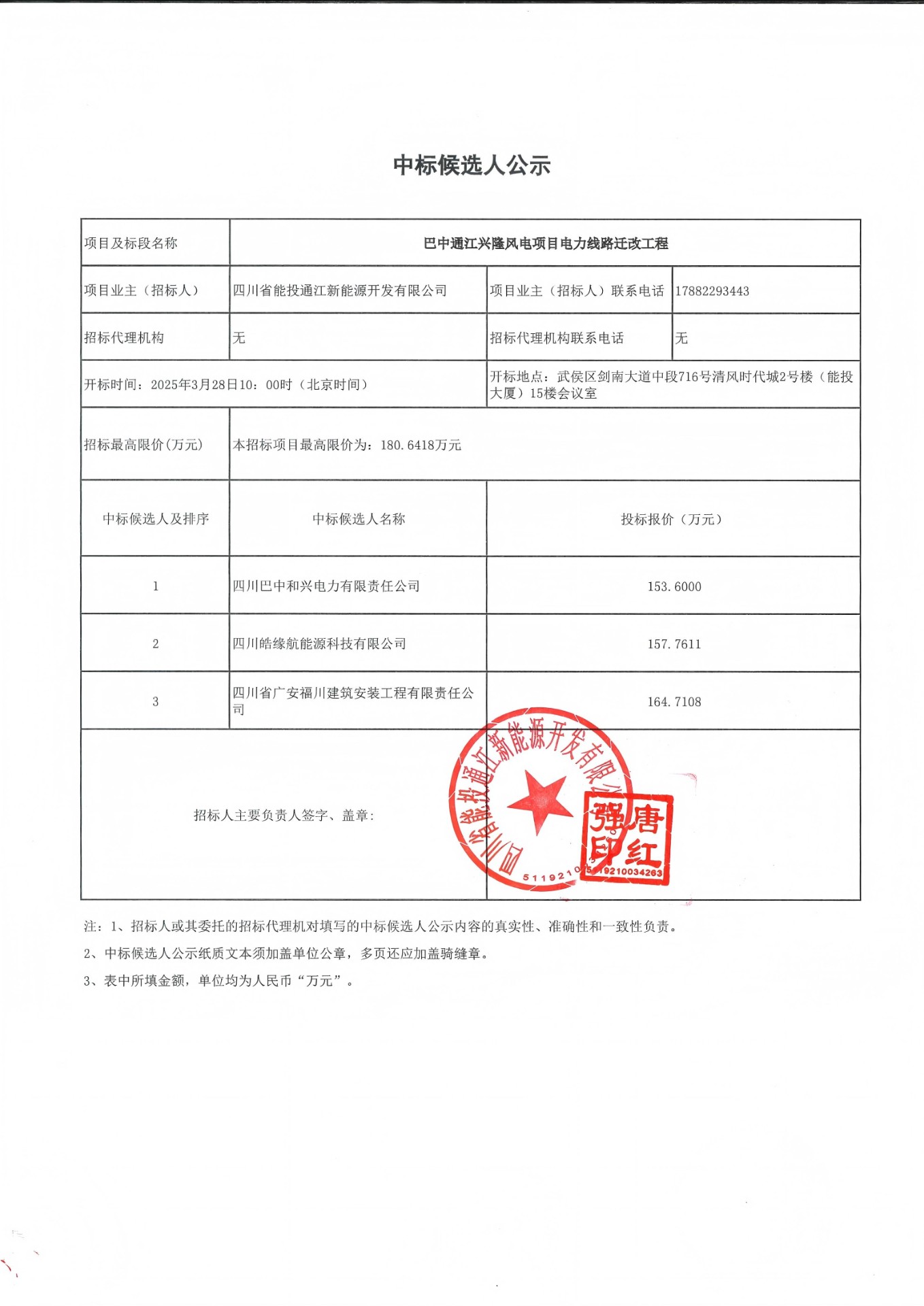 四川省能投通江新能源开发有限公司关于巴中通江兴隆风电项目电力线路迁改工程的中标候选人公示