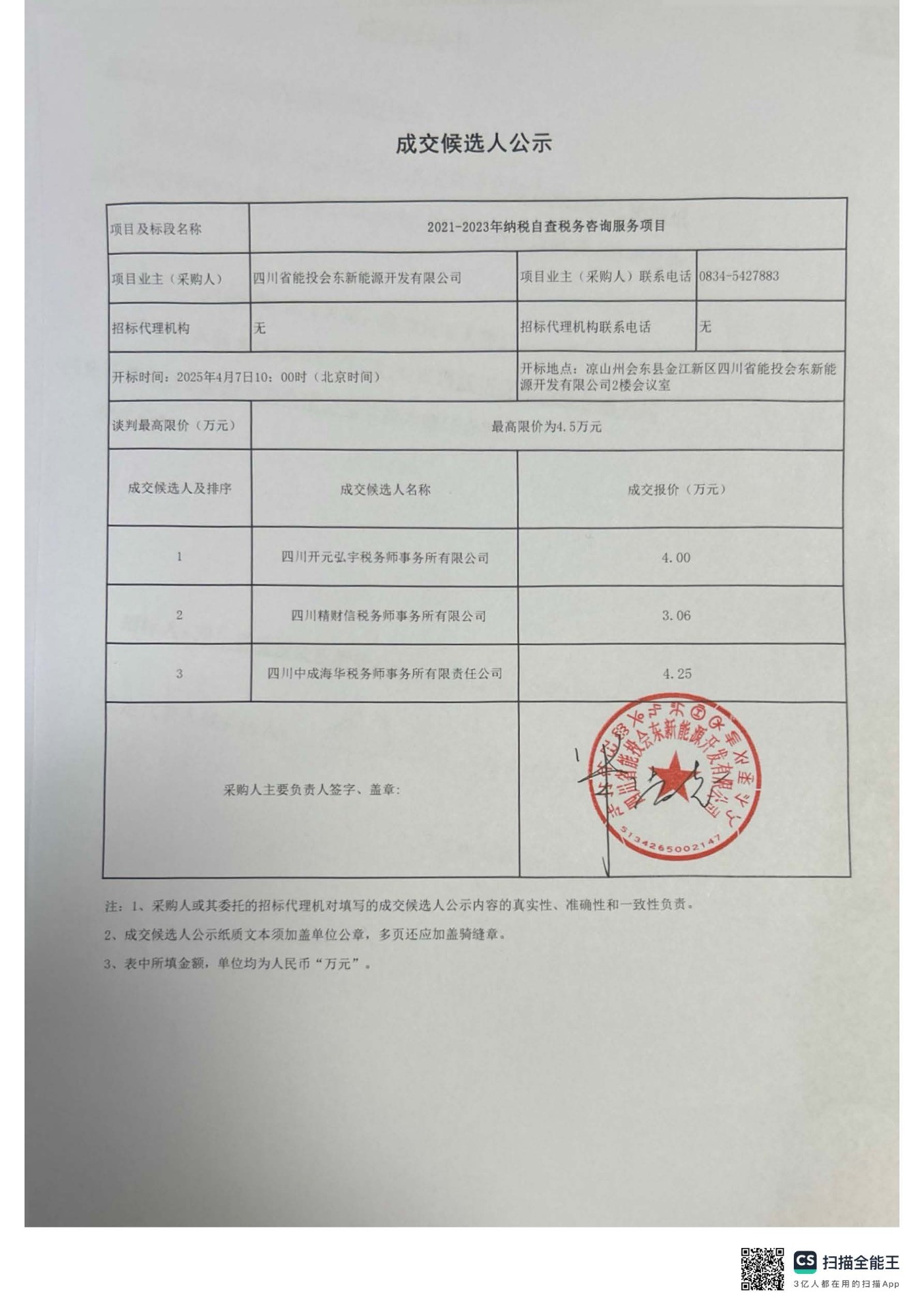 四川省能投会东新能源开发有限公司关于2021-2023年纳税自查税务咨询服务项目的成交候选人公示