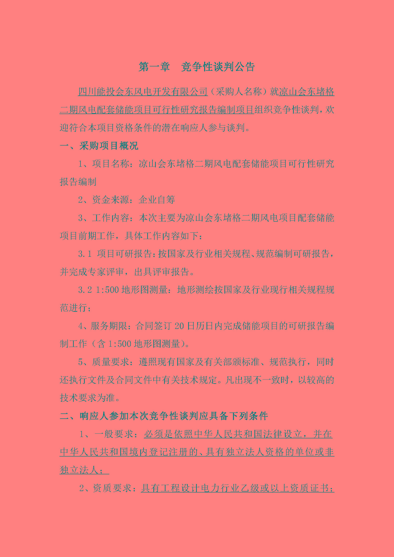 四川能投会东风电开发有限公司(采购人名称)就凉山会东堵格二期风电配套储能项目可行性研究报告编制项目组织竞争性谈判,欢迎符合本项目资格条件的潜在响应人参与谈判。