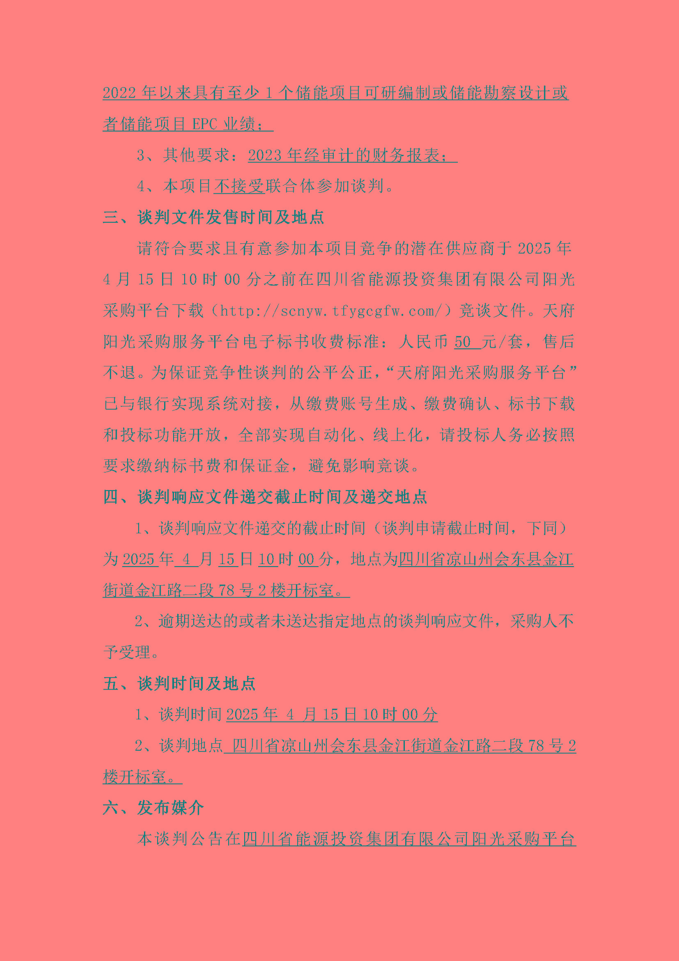 请符合要求且有意参加本项目竞争的潜在供应商于2025年4月15日10时之前在四川省能源投资集团有限公司阳光采购平台下载(http://scnyw.tfygcgfw.com/)竞谈文件。天府阳光采购服务平台电子标书收费标准:人民币50 元/套,售后不退。为保证竞争性谈判的公平公正,“天府阳光采购服务平台”已与银行实现系统对接,从缴费账号生成、缴费确认、标书下载和投标功能开放,全部实现自动化、线上化,请投标人务必按照要求缴纳标书费和保证金,避免影响竞谈。