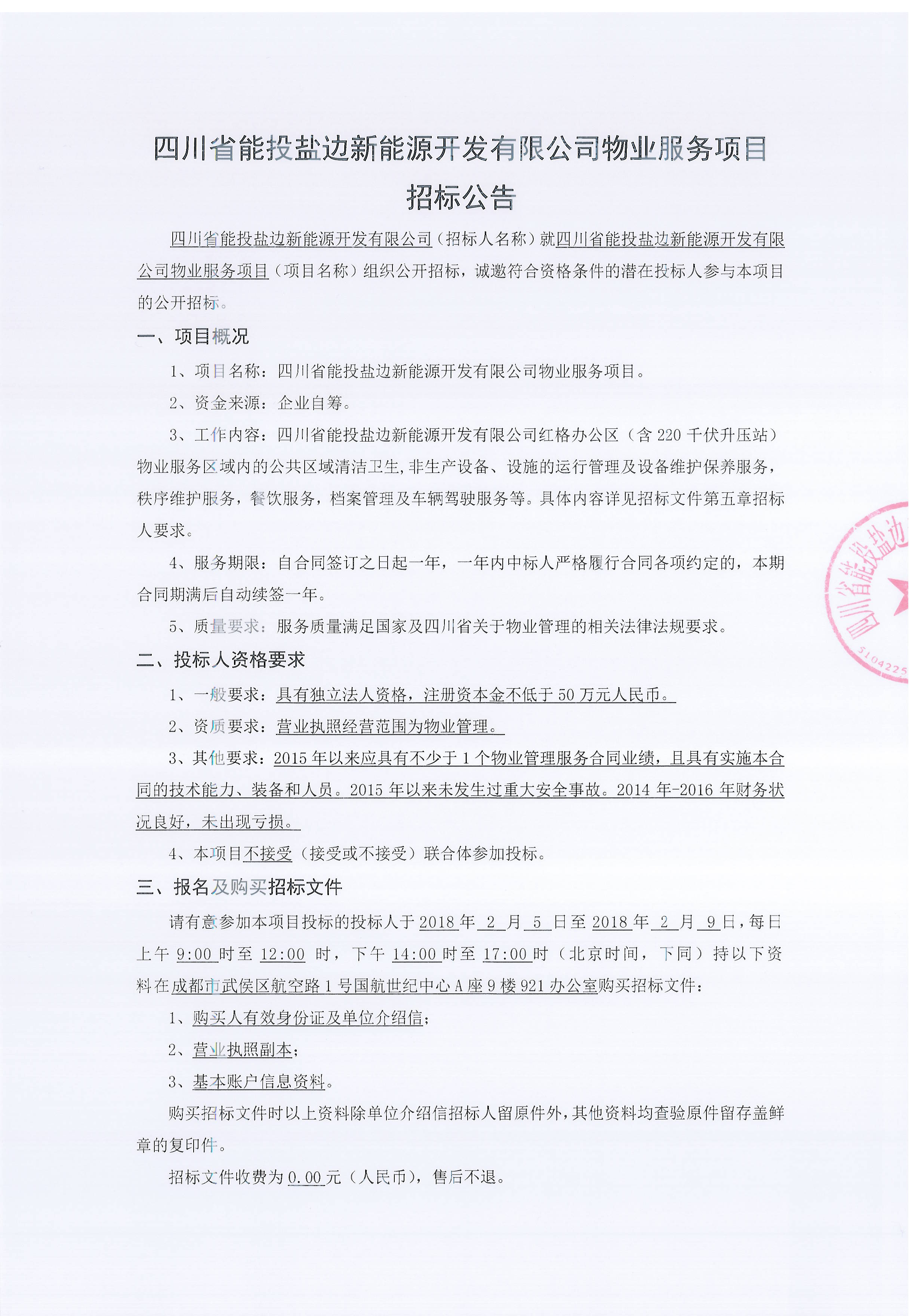 四川省能投盐边新能源开发有限公司(招标人名称)就四川省能投盐边新能源开发有限公司物业服务项目(项目名称)组织公开招标,诚邀符合资格条件的潜在投标人参与本项目的公开招标。