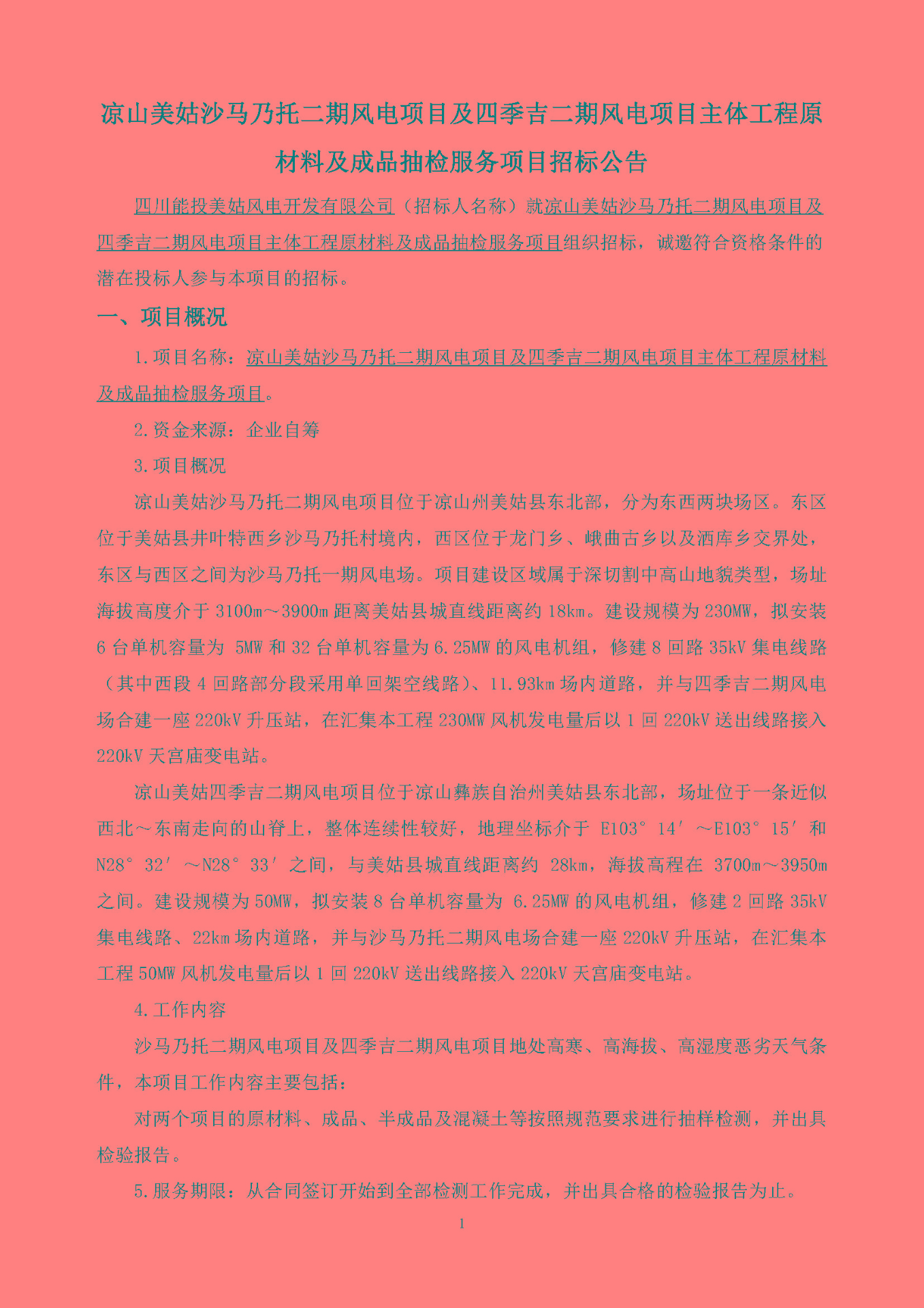 1.项目名称:凉山美姑沙马乃托二期风电项目及四季吉二期风电项目主体工程原材料及成品抽检服务项目。