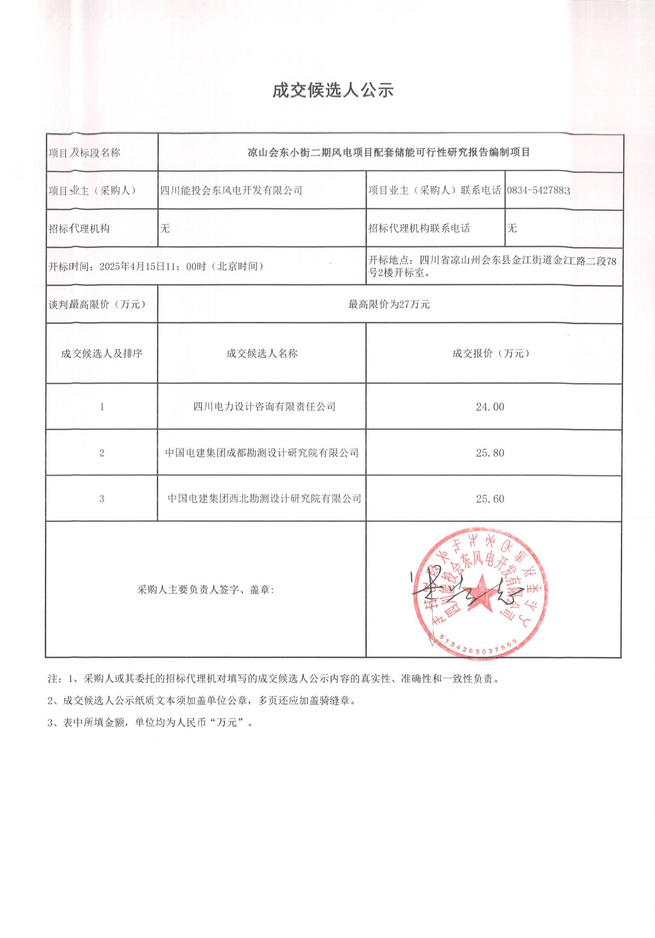 四川能投会东风电开发有限公司关于凉山会东小街二期风电项目配套储能可行性研究报告编制项目的成交候选人公示