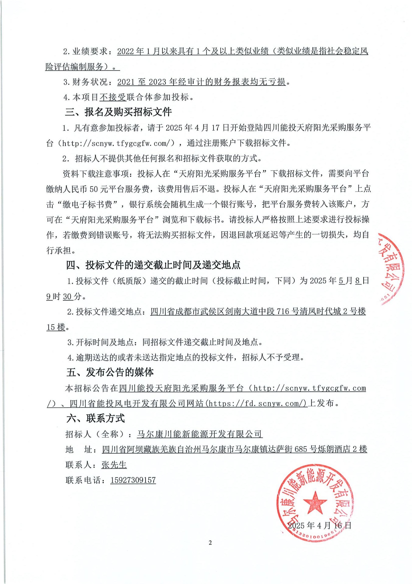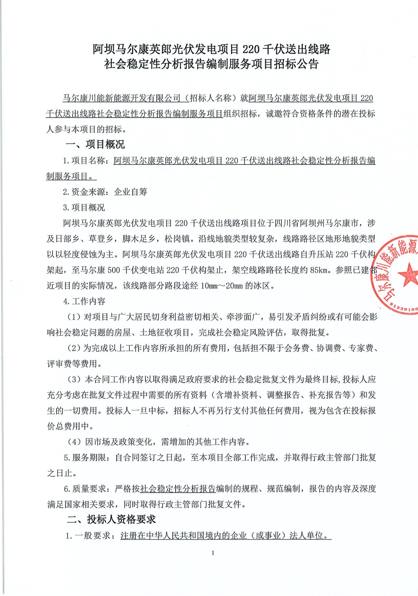 马尔康川能新能源开发有限公司(招标人名称)就阿坝马尔康英郎光伏发电项目220千伏送出线路社会稳定性分析报告编制服务项目组织招标,诚邀符合资格条件的潜在投标人参与本项目的招标。