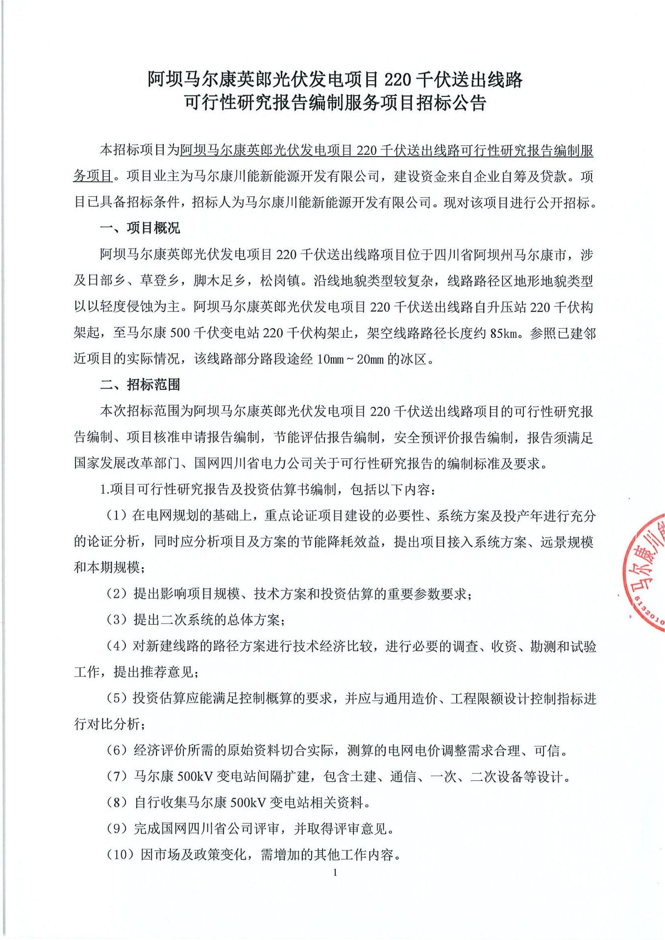 本招标项目为阿坝马尔康英郎光伏发电项目220千伏送出线路可行性研究报告编制服务项目。项目业主为马尔康川能新能源开发有限公司,建设资金来自企业自筹及贷款。项目已具备招标条件,招标人为马尔康川能新能源开发有限公司。现对该项目进行公开招标。