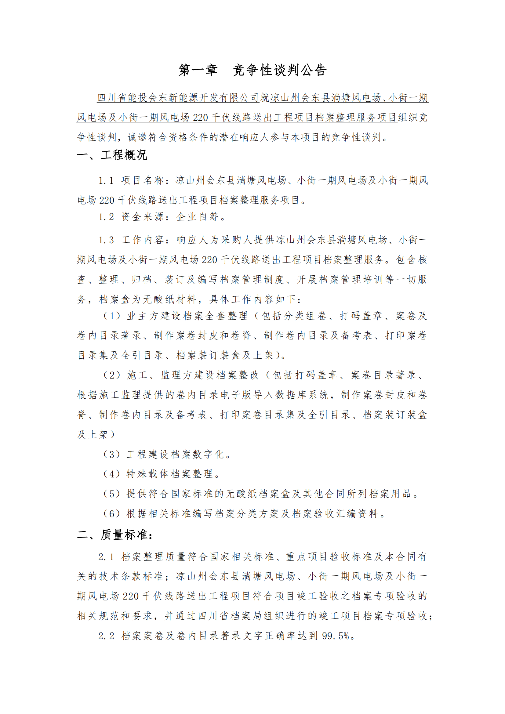 1.1 项目名称:凉山州会东县淌塘风电场、小街一期风电场及小街一期风电场220千伏线路送出工程项目档案整理服务项目。