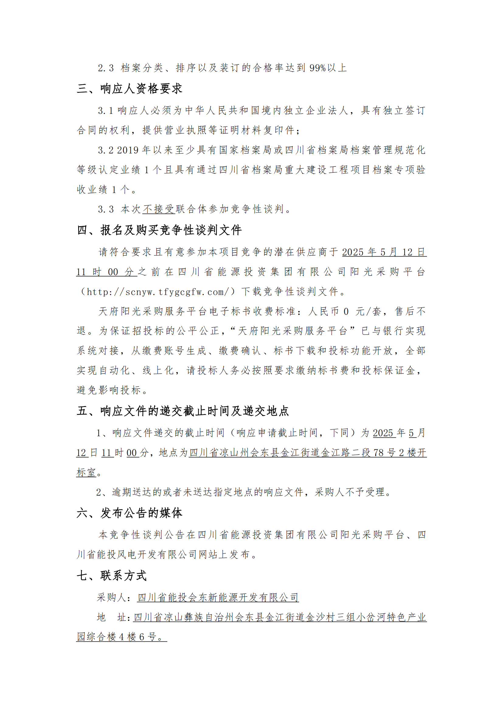 四川省能投会东新能源开发有限公司就凉山州会东县淌塘风电场、小街一期风电场及小街一期风电场220千伏线路送出工程项目档案整理服务项目组织竞争性谈判,诚邀符合资格条件的潜在响应人参与本项目的竞争性谈判。