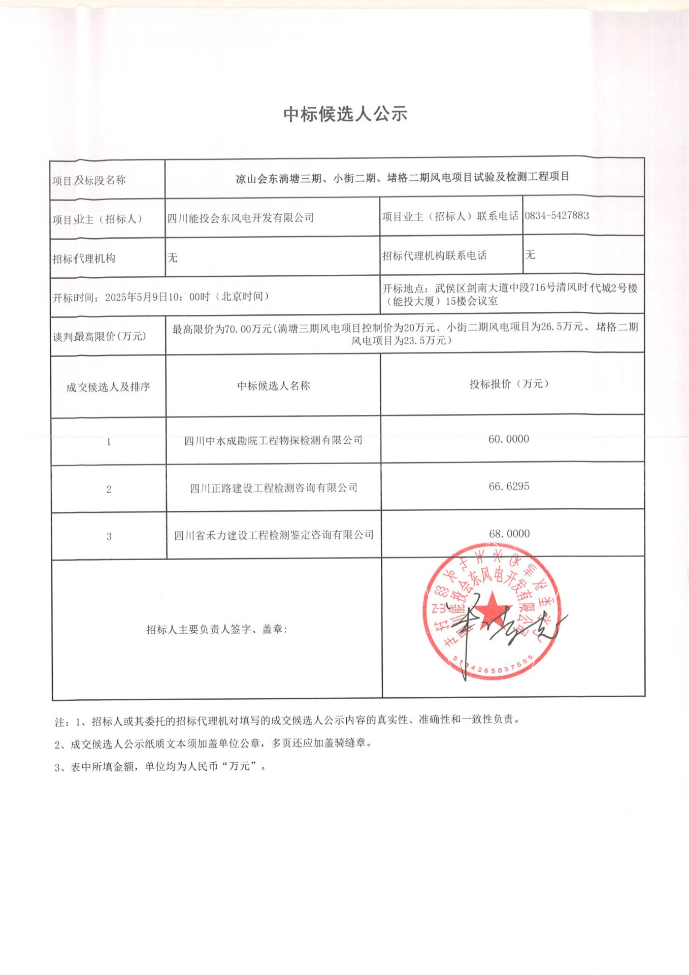 四川能投会东风电开发有限公司关于凉山会东淌塘三期、小街二期、堵格二期风电项目试验及检测工程项目的中标候选人公示