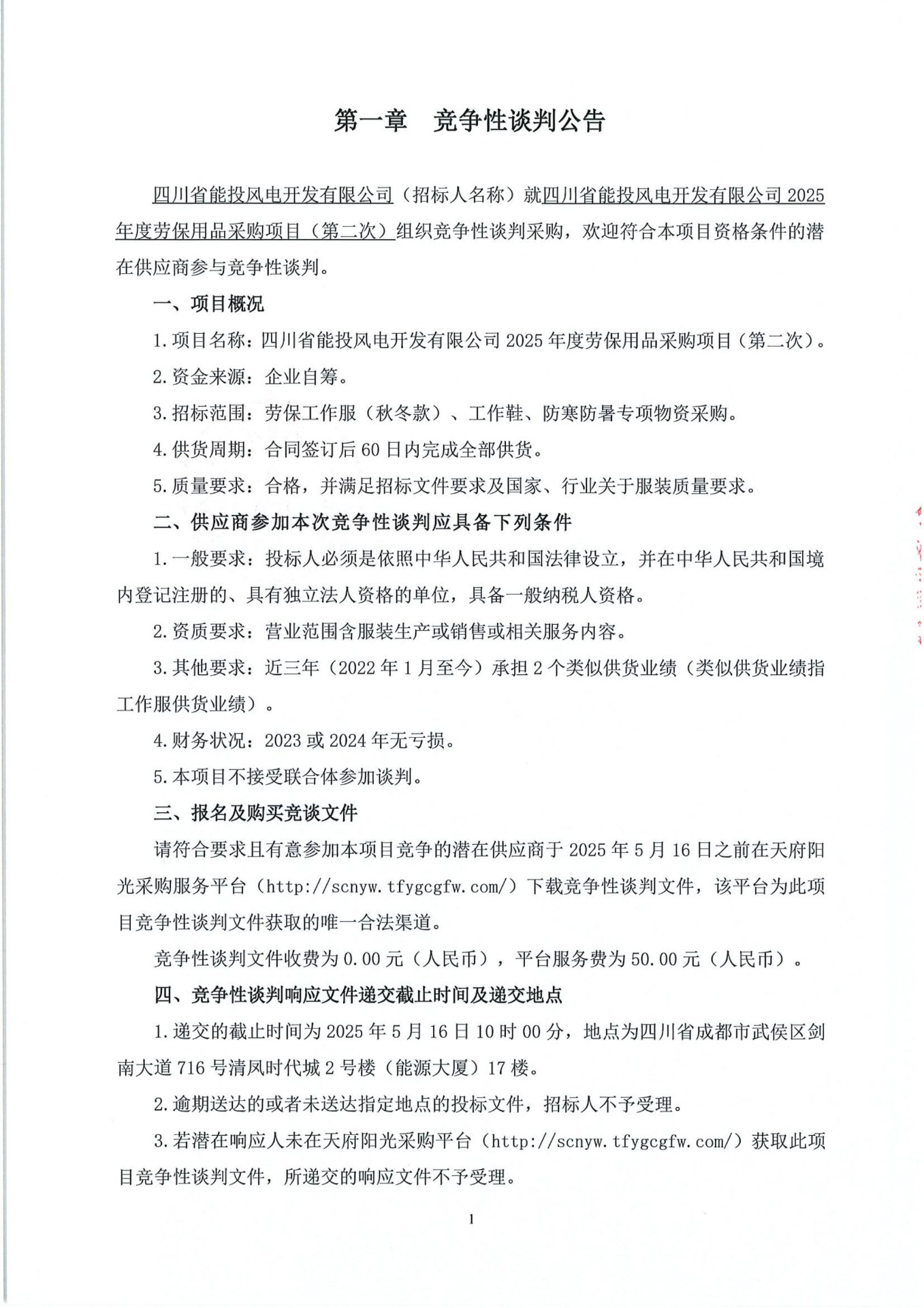 请符合要求且有意参加本项目竞争的潜在供应商于2025年5月16日之前在天府阳 光采购服务平台 (http://scnyw.tfygcgfw.com/) 下载竞争性谈判文件,该平台为此项 目竞争性谈判文件获取的唯一合法渠道。