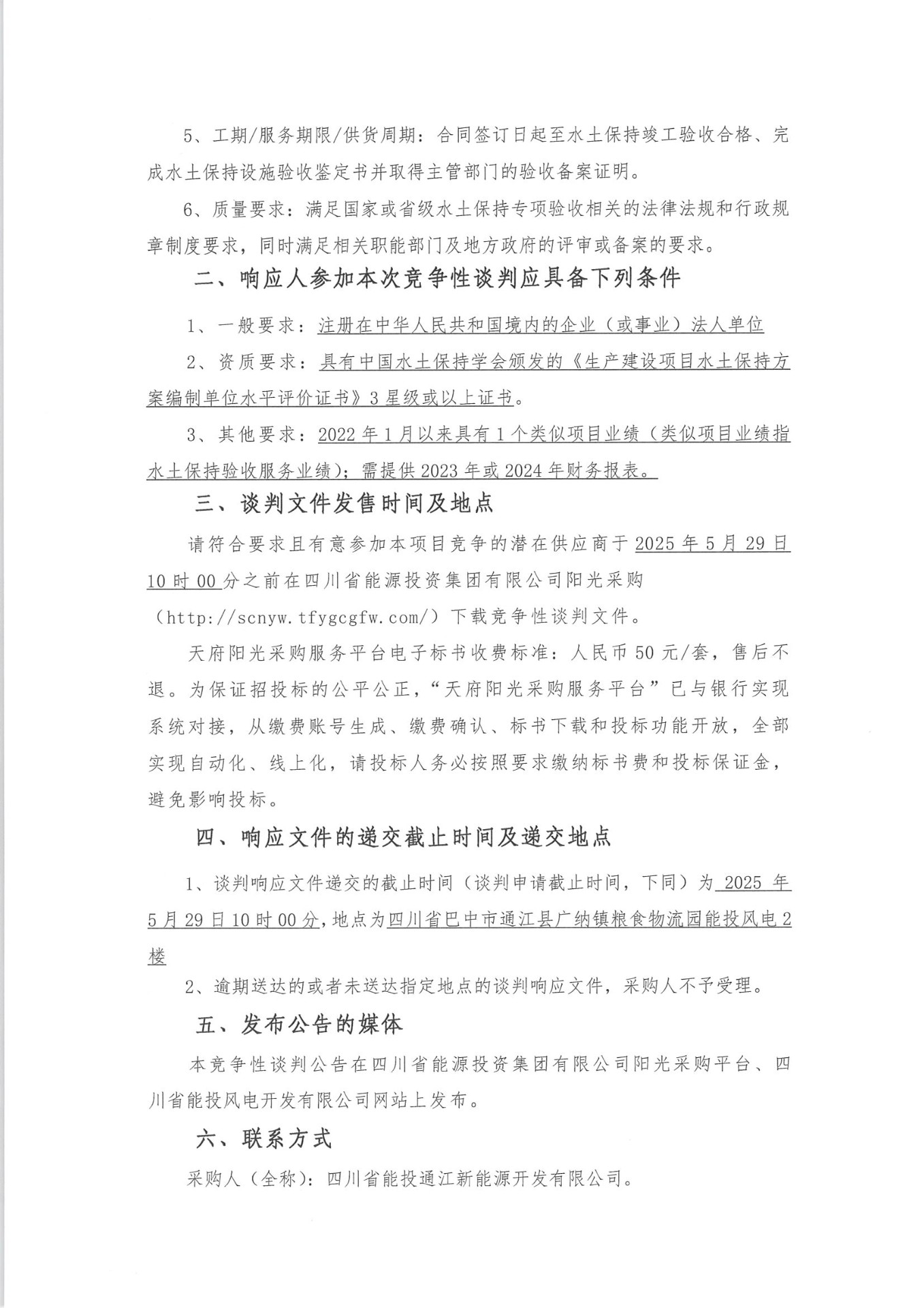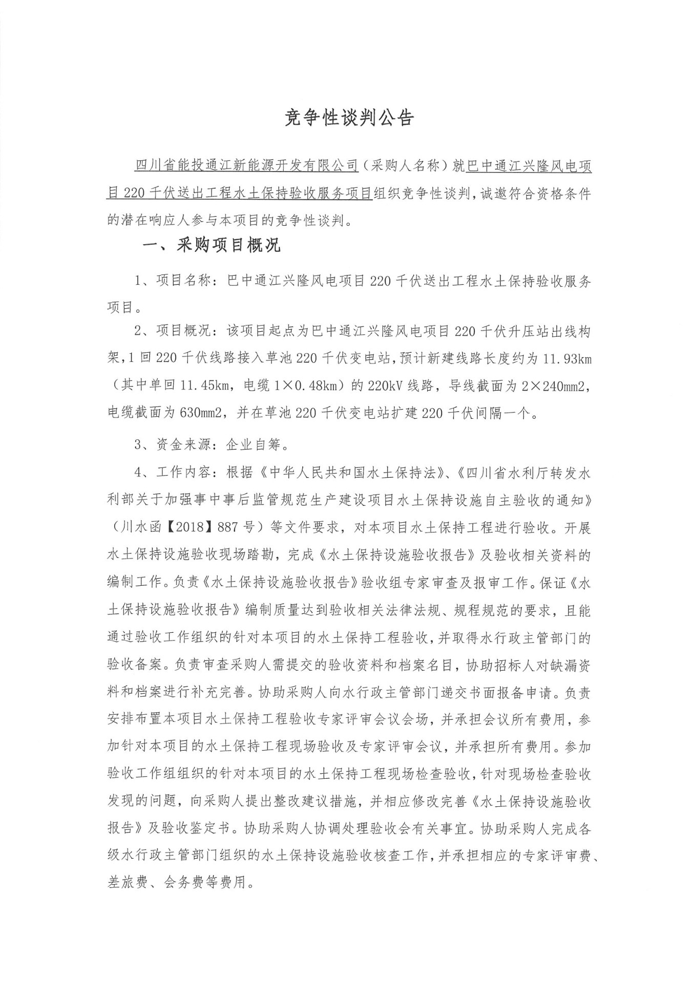 四川省能投通江新能源开发有限公司(采购人名称)就巴中通江兴隆风电项目220千伏送出工程水土保持验收服务项目组织竞争性谈判,诚邀符合资格条件的潜在响应人参与本项目的竞争性谈判。