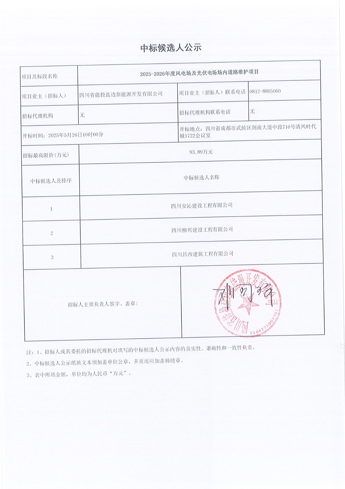 四川省能投盐边新能源开发有限公司关于2025-2026年度风电场及光伏电场场内道路维护项目的中标候选人公示