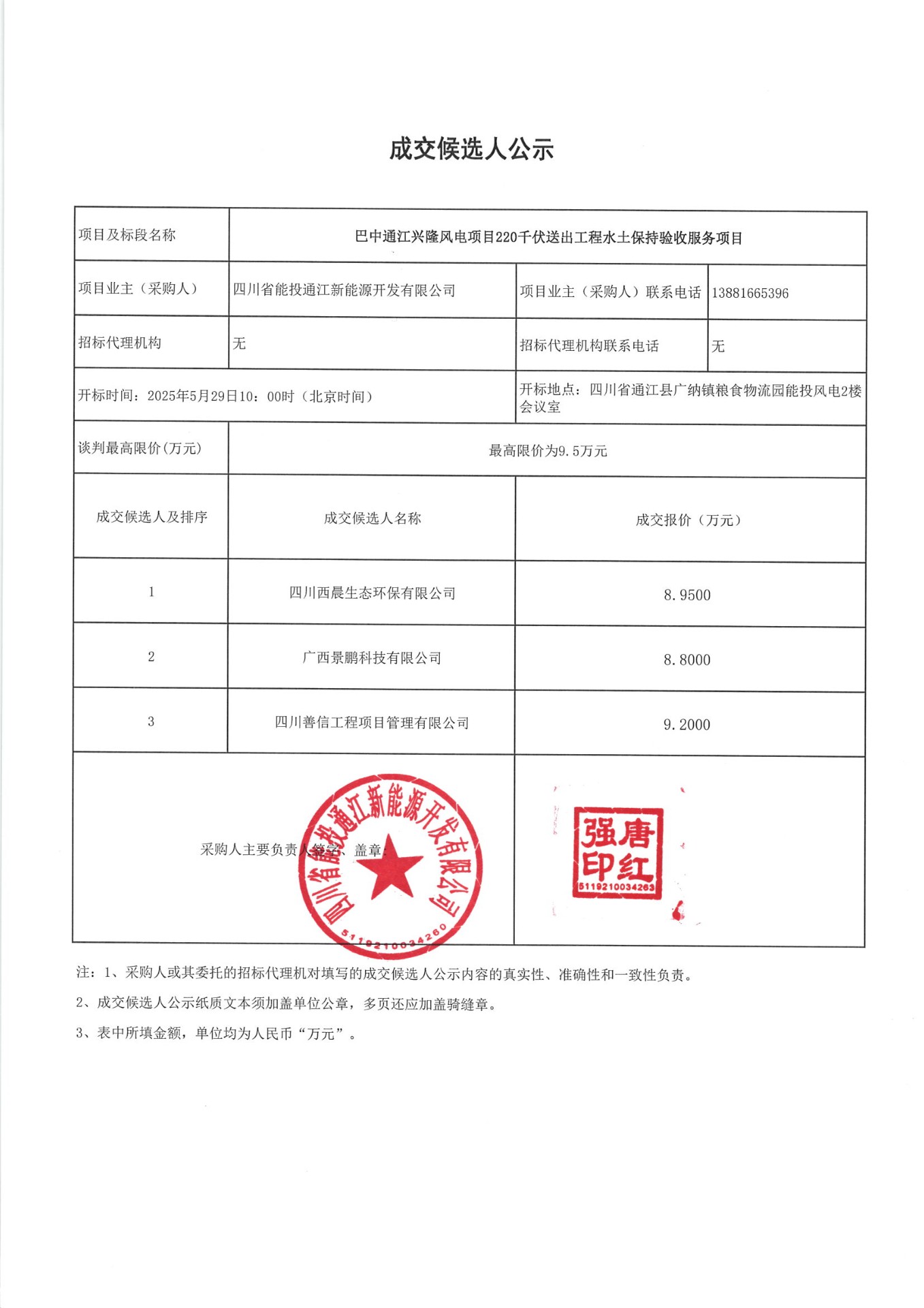 四川省能投通江新能源开发有限公司关于巴中通江兴隆风电项目220千伏送出工程水土保持验收服务项目的成交候选人公示