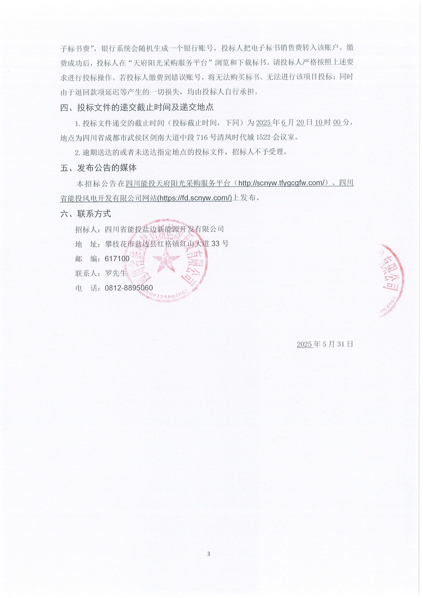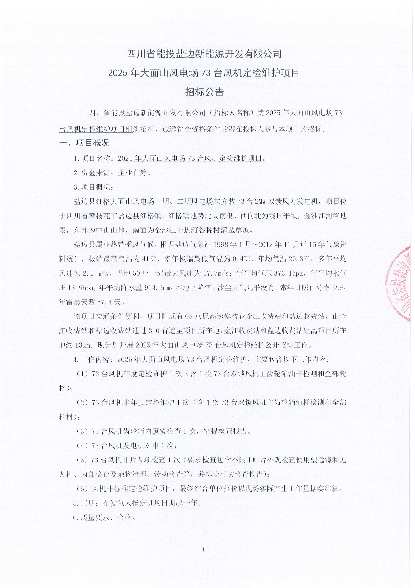 四川省能投盐边新能源开发有限公司(招标人名称)就2025年大面山风电场73台风机定检维护项目组织招标,诚邀符合资格条件的潜在投标人参与本项目的招标。