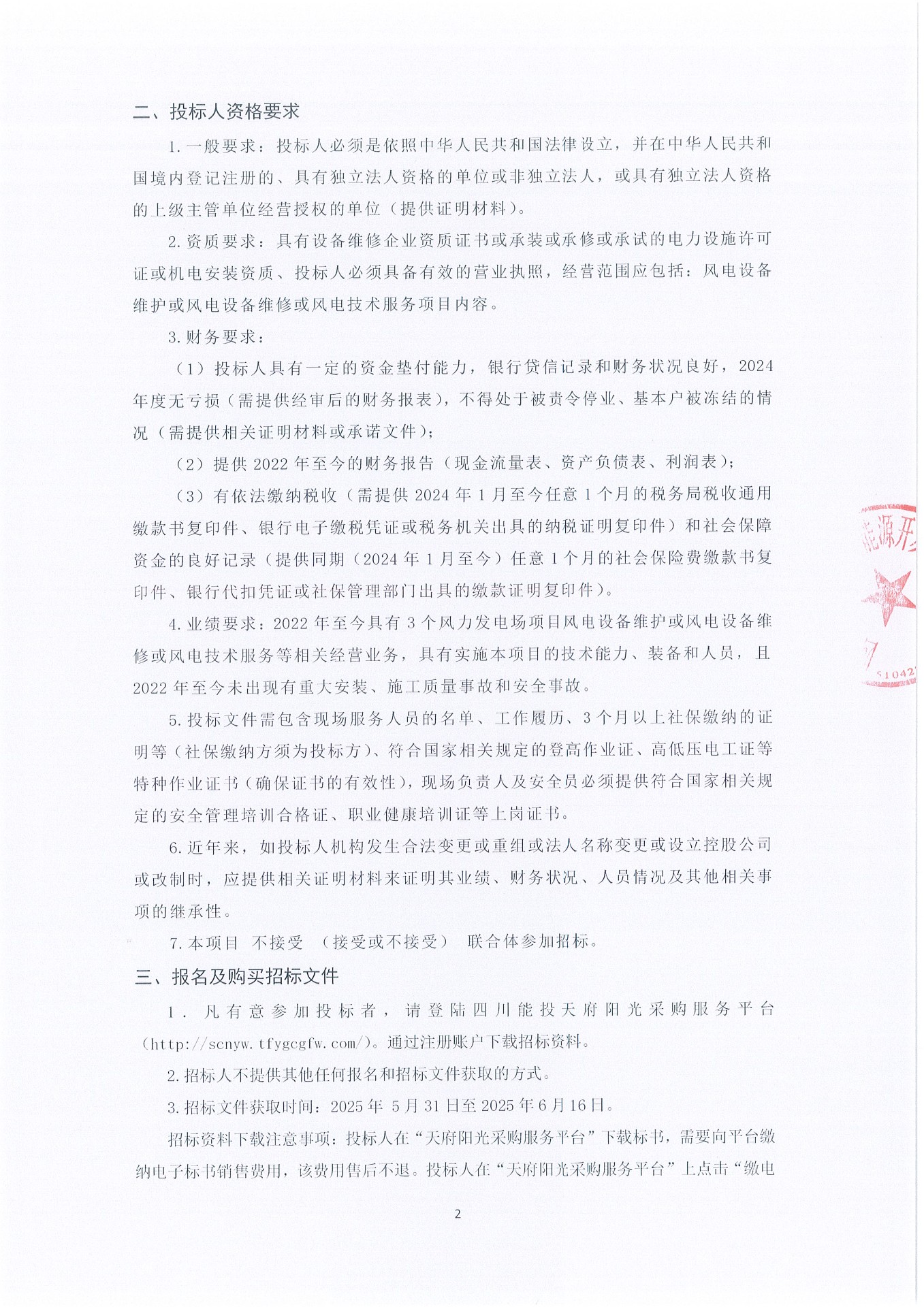 1.项目名称:2025年大面山风电场73台风机定检维护项目。