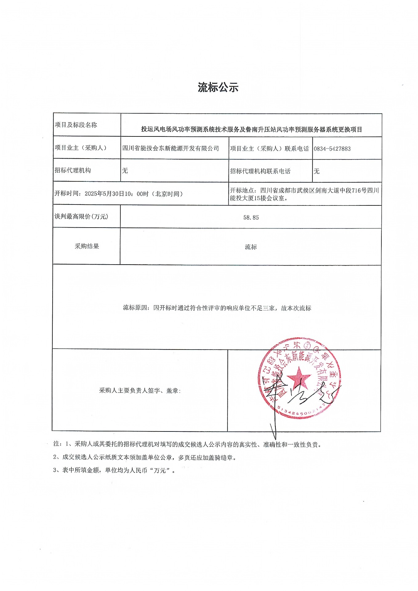 四川省能投会东新能源开发有限公司关于投运风电场风功率预测系统技术服务及鲁南升压站风功率预测服务器系统更换项目的流标公示
