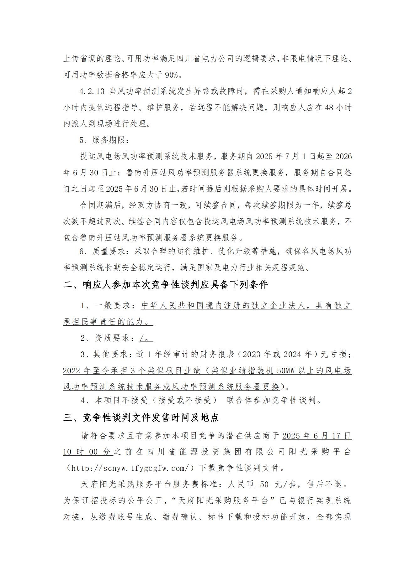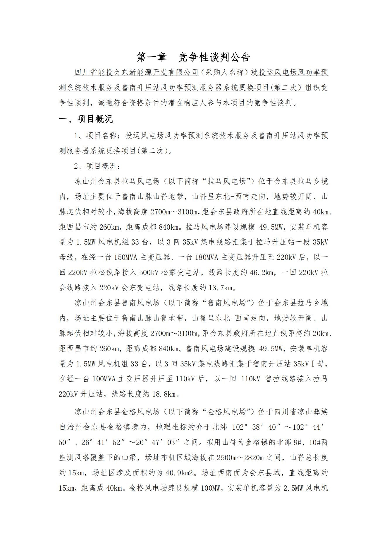 四川省能投会东新能源开发有限公司(采购人名称)就投运风电场风功率预测系统技术服务及鲁南升压站风功率预测服务器系统更换项目(第二次)组织竞争性谈判,诚邀符合资格条件的潜在响应人参与本项目的竞争性谈判。