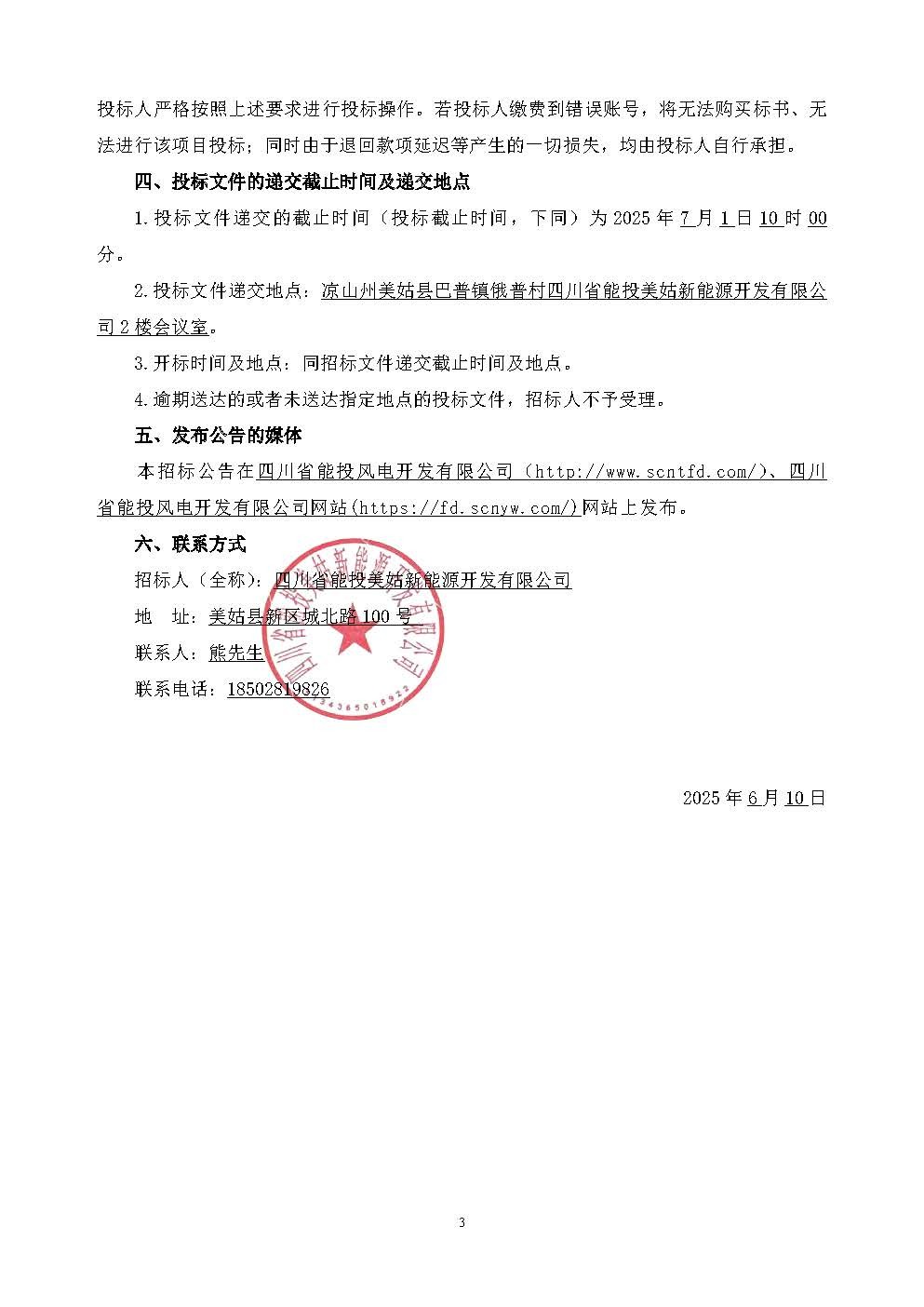 2.投标文件递交地点:凉山州美姑县巴普镇俄普村四川省能投美姑新能源开发有限公司2楼会议室。