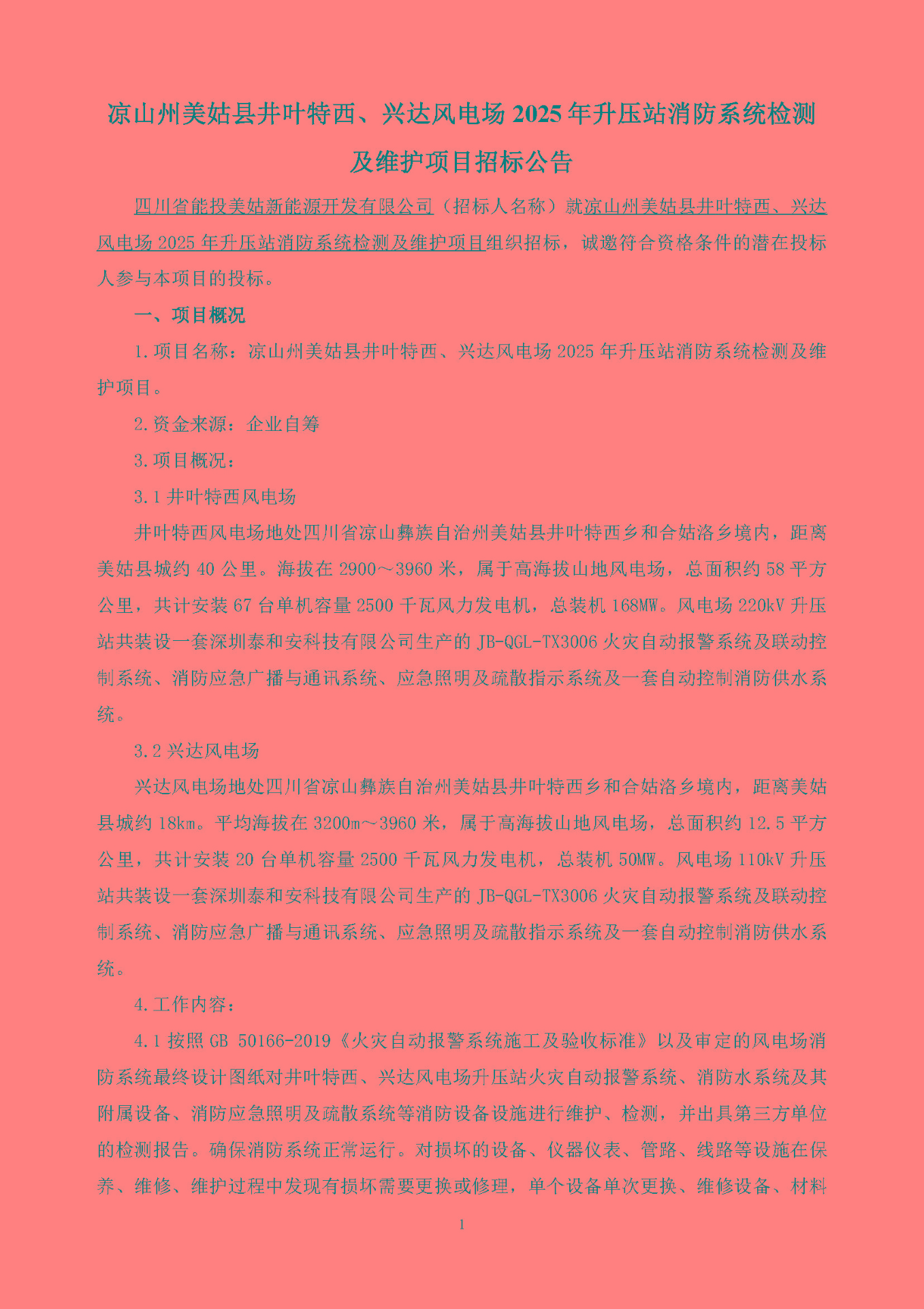 1.项目名称:凉山州美姑县井叶特西、兴达风电场2025年升压站消防系统检测及维护项目。