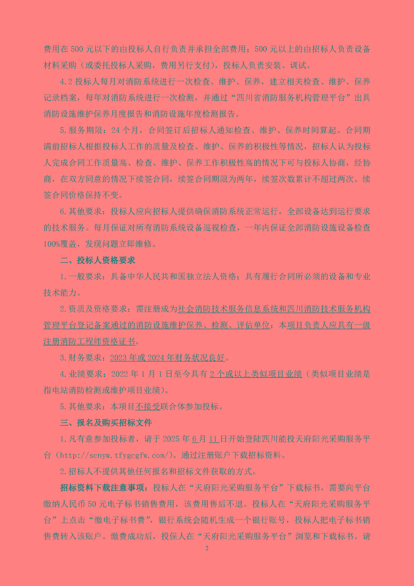 2.资质及资格要求:需注册成为社会消防技术服务信息系统和四川消防技术服务机构管理平台登记备案通过的消防设施维护保养、检测、评估单位;本项目负责人应具有一级注册消防工程师资格证书。