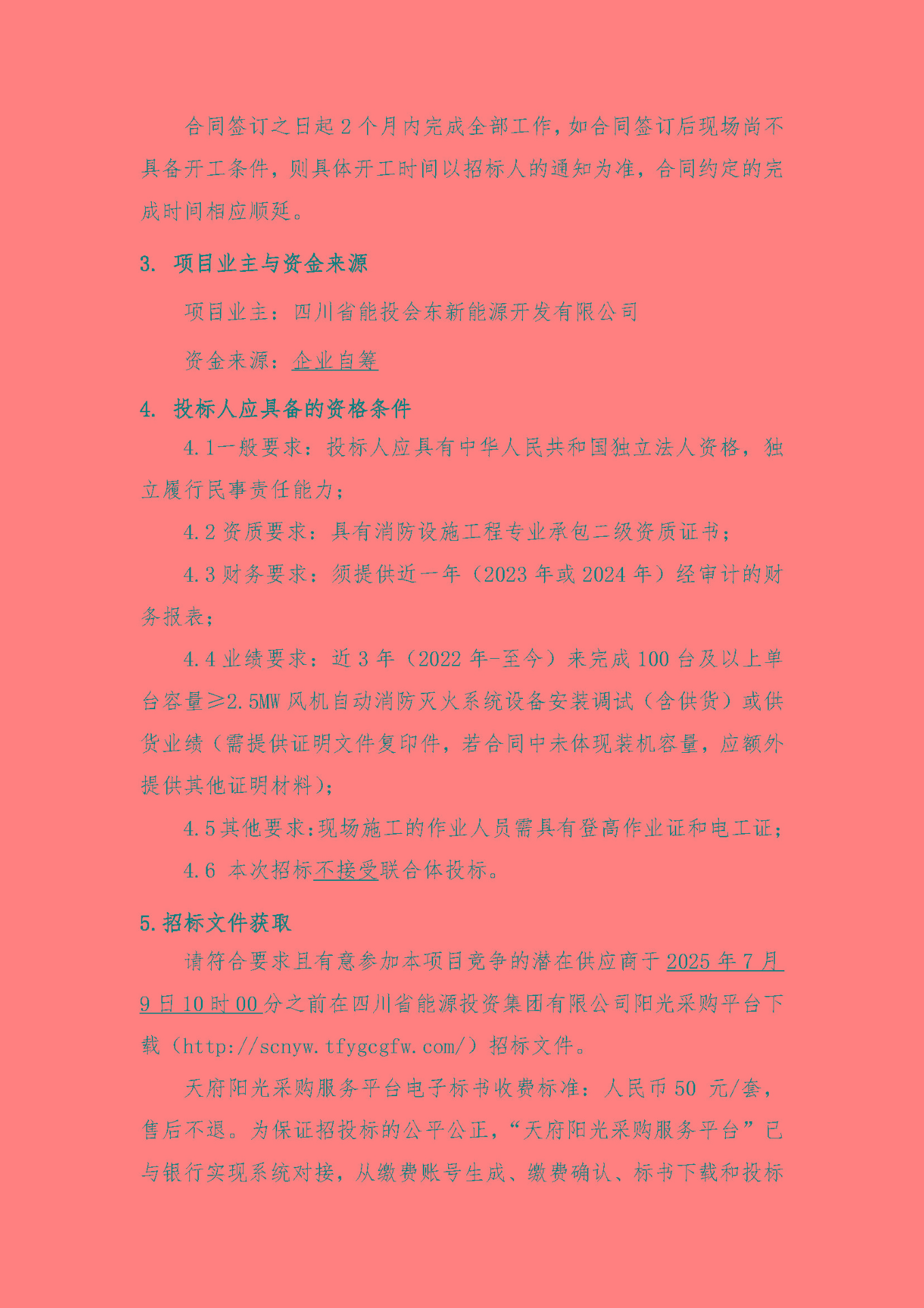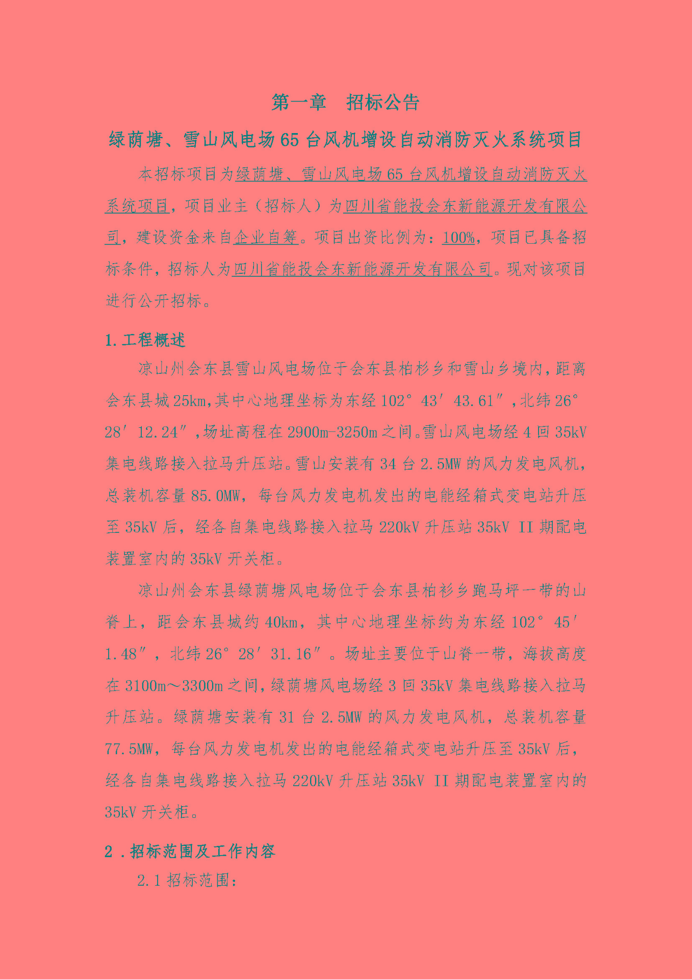 本招标项目为绿荫塘、雪山风电场65台风机增设自动消防灭火系统项目,项目业主(招标人)为四川省能投会东新能源开发有限公司,建设资金来自企业自筹。项目出资比例为:100%,项目已具备招标条件,招标人为四川省能投会东新能源开发有限公司。现对该项目进行公开招标。