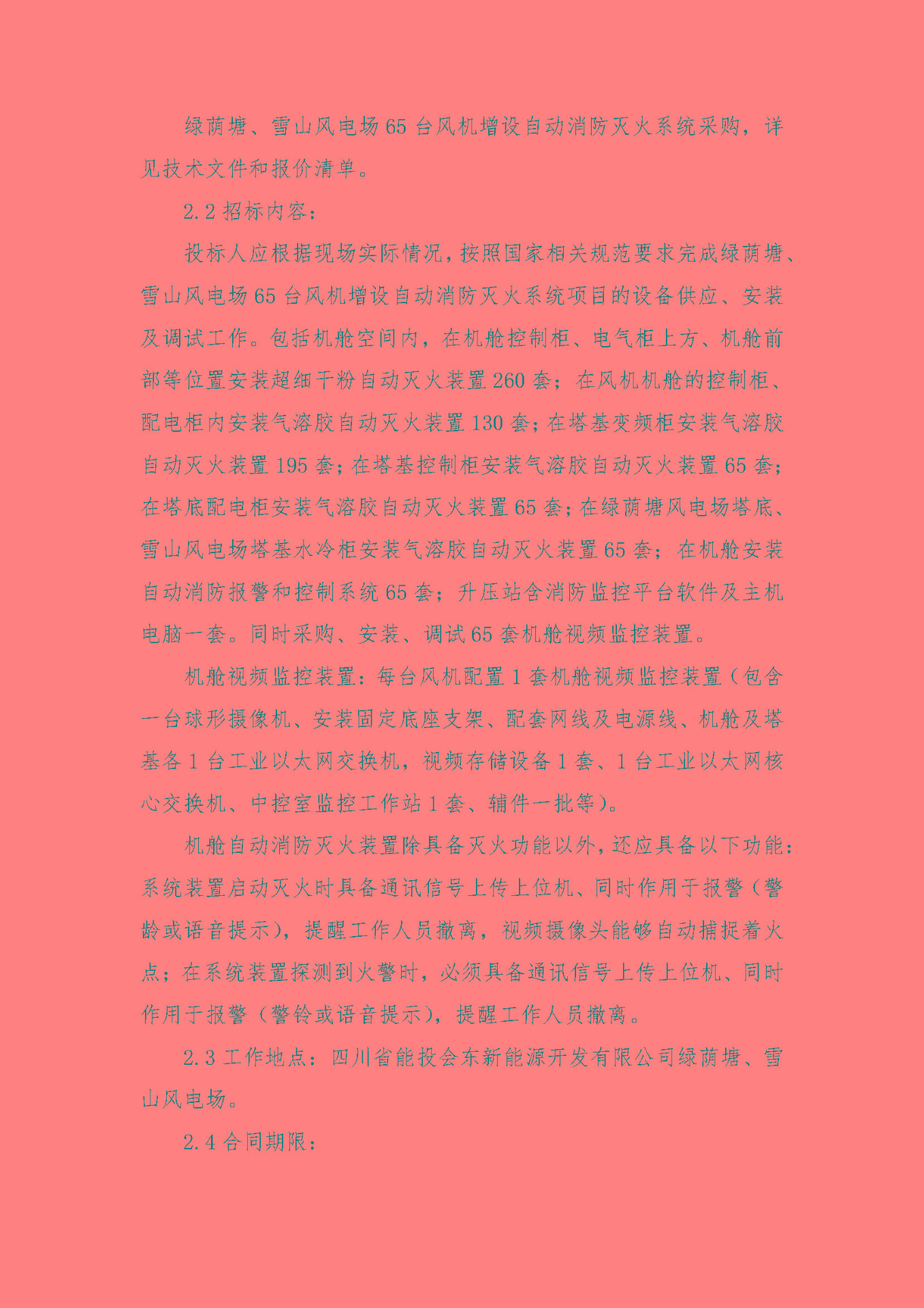 绿荫塘、雪山风电场65台风机增设自动消防灭火系统采购,详见技术文件和报价清单。