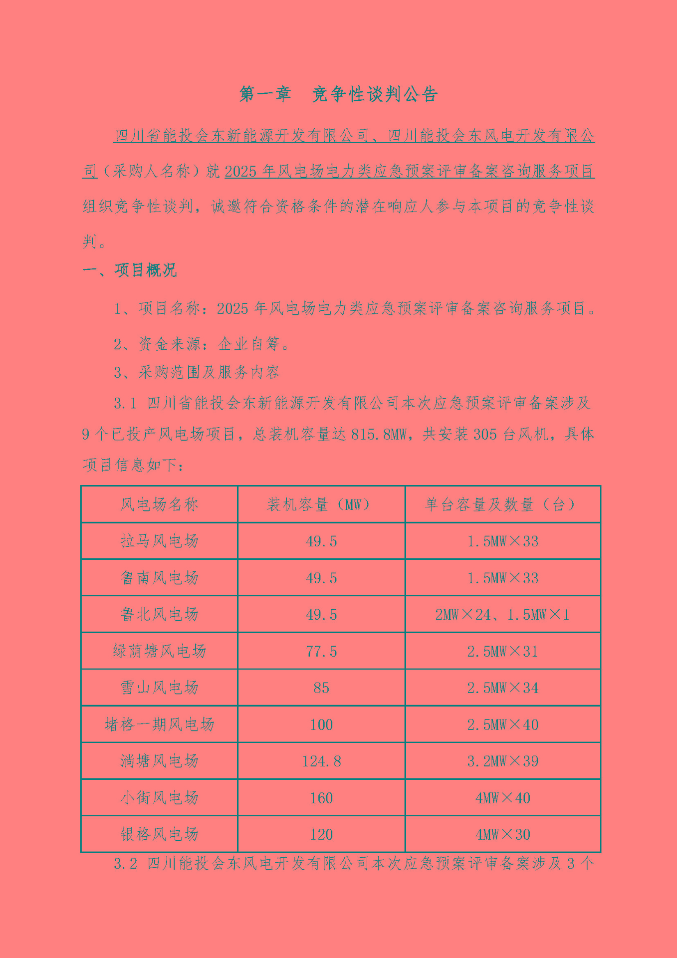 四川省能投会东新能源开发有限公司、四川能投会东风电开发有限公司(采购人名称)就2025年风电场电力类应急预案评审备案咨询服务项目组织竞争性谈判,诚邀符合资格条件的潜在响应人参与本项目的竞争性谈判。