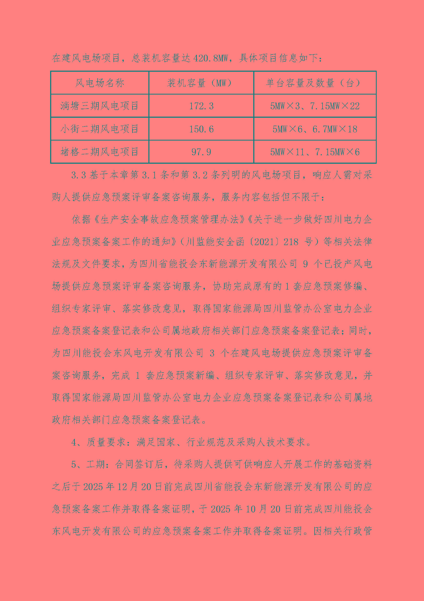 5、工期:合同签订后,待采购人提供可供响应人开展工作的基础资料之后于2025年12月20日前完成四川省能投会东新能源开发有限公司的应急预案备案工作并取得备案证明,于2025年10月20日前完成四川能投会东风电开发有限公司的应急预案备案工作并取得备案证明。因相关行政管理部门的政策改变,造成应急预案的备案工作无法按预定时间进行,此项规定的时间相应顺延。