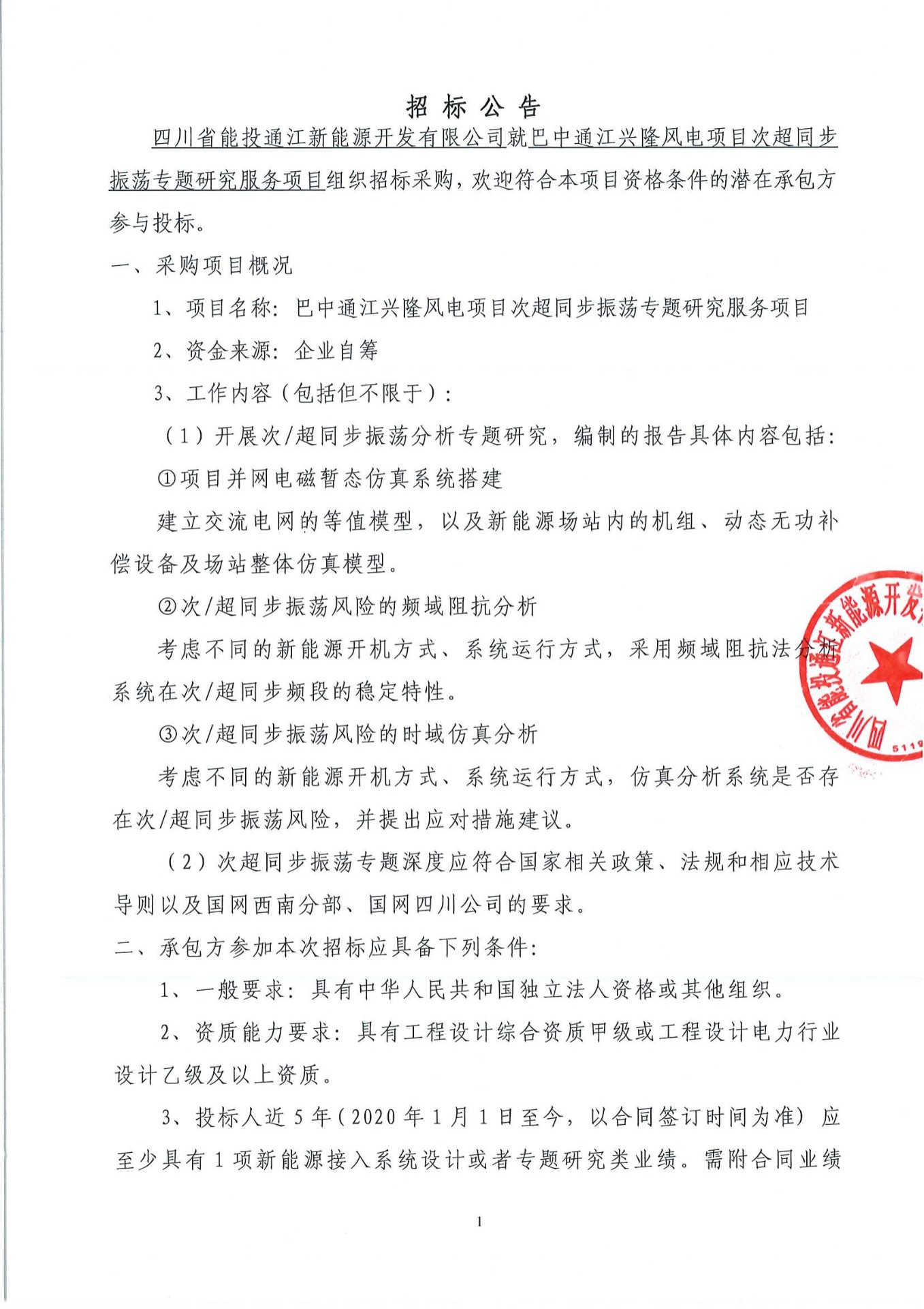 四川省能投通江新能源开发有限公司就巴中通江兴隆风电项目次超同步振荡专题研究服务项目组织招标采购,欢迎符合本项目资格条件的潜在承包方参与投标。