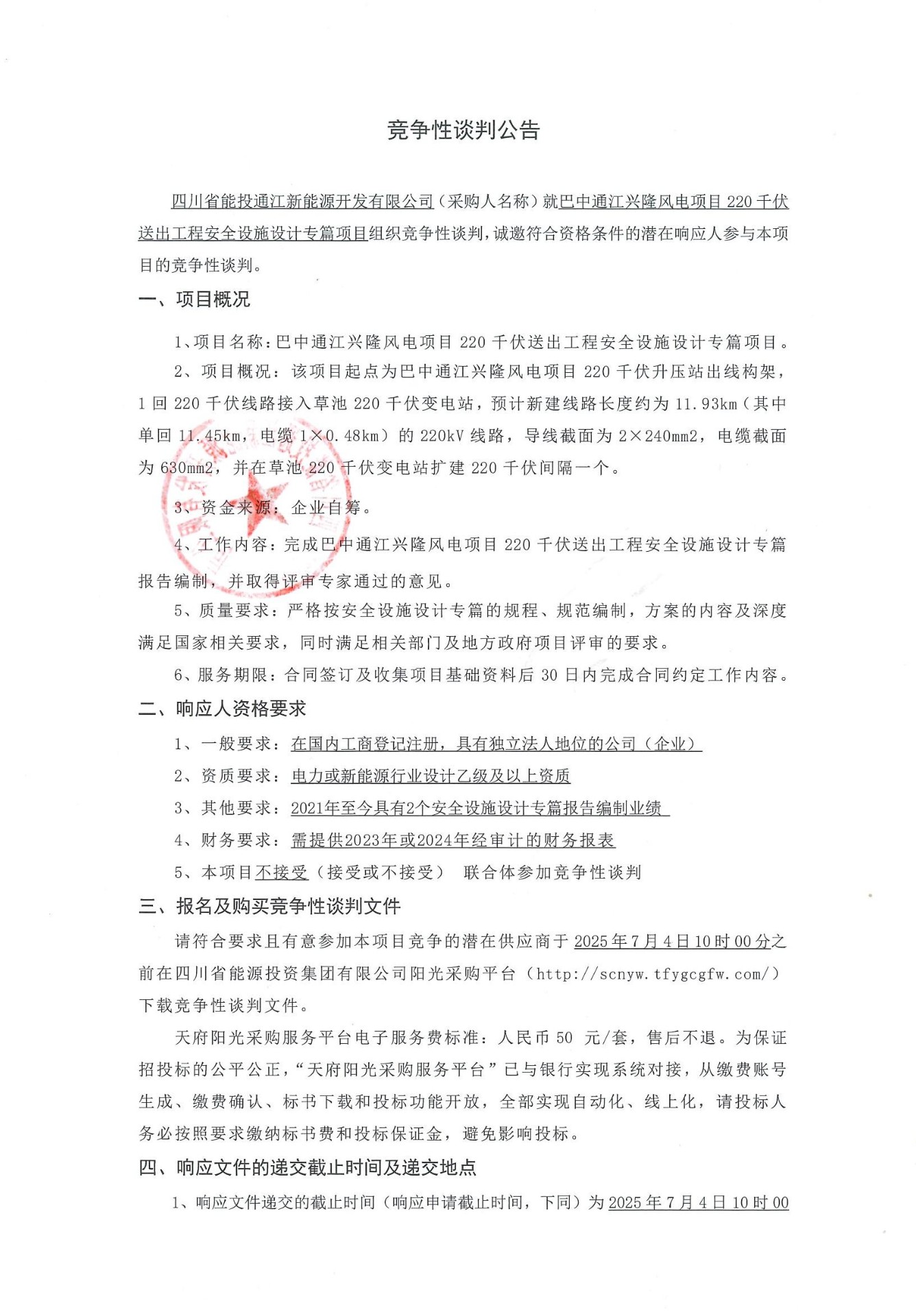 四川省能投通江新能源开发有限公司(采购人名称)就巴中通江兴隆风电项目220千伏送出工程安全设施设计专篇项目组织竞争性谈判,诚邀符合资格条件的潜在响应人参与本项目的竞争性谈判。