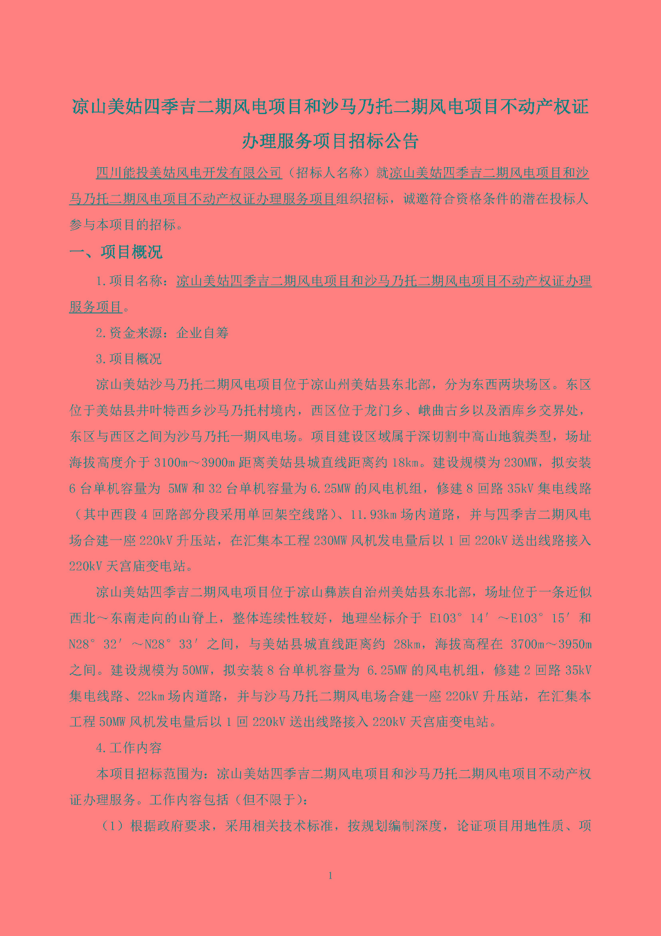 1.项目名称:凉山美姑四季吉二期风电项目和沙马乃托二期风电项目不动产权证办理服务项目。