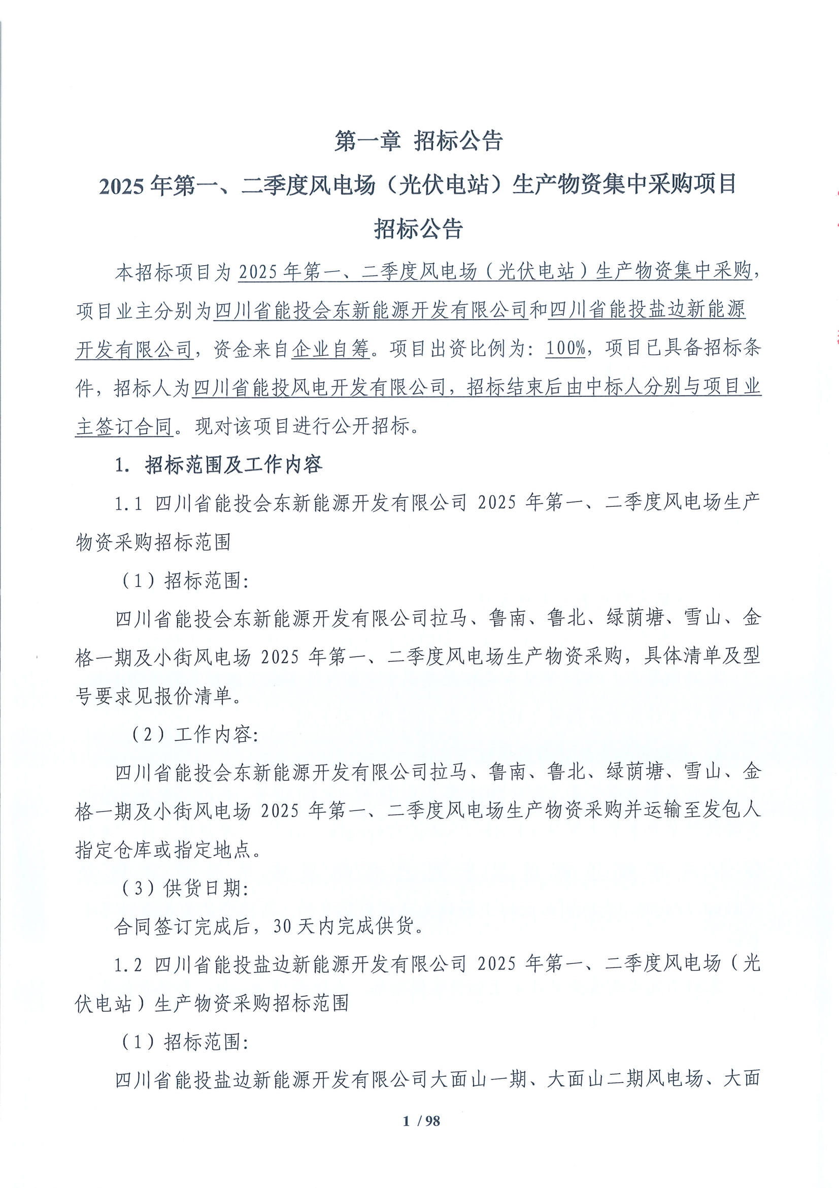 四川省能投会东新能源开发有限公司拉马、鲁南、鲁北、绿荫塘、雪山、金格一期及小街风电场2025年第一、二季度风电场生产物资采购并运输至发包人指定仓库或指定地点。