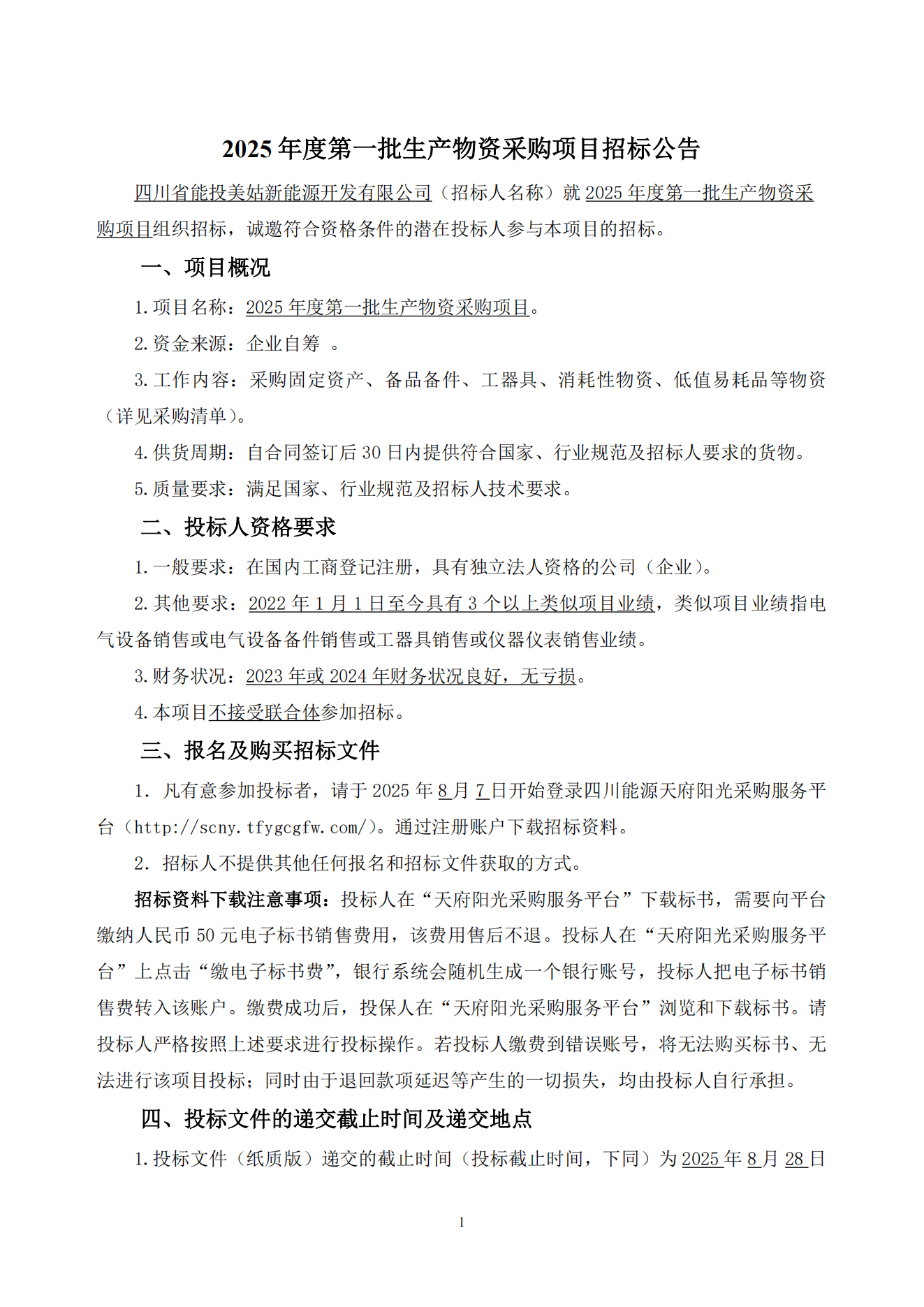 四川省能投美姑新能源开发有限公司(招标人名称)就2025年度第一批生产物资采购项目组织招标,诚邀符合资格条件的潜在投标人参与本项目的招标。