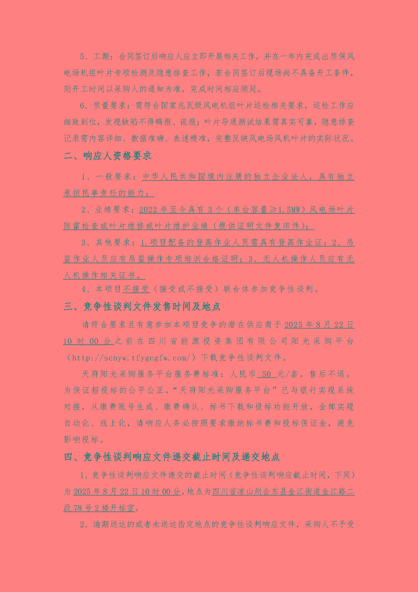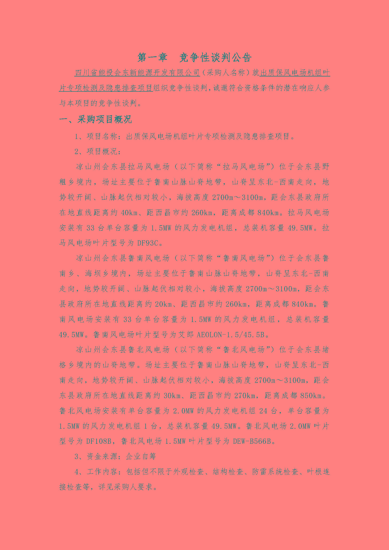 四川省能投会东新能源开发有限公司(采购人名称)就出质保风电场机组叶片专项检测及隐患排查项目组织竞争性谈判,诚邀符合资格条件的潜在响应人参与本项目的竞争性谈判。
