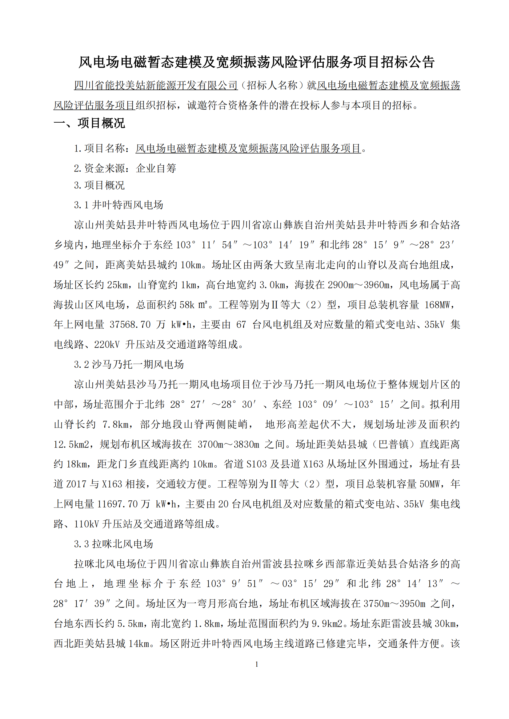 本项目招标范围为:四川省能投美姑新能源开发有限公司所属井叶特西风电场、沙马乃托一期风电场及四川省能投雷波新能源开发有限公司所属拉咪北风电场电磁暂态建模及宽频振荡风险评估服务。工作内容包括(但不限于):