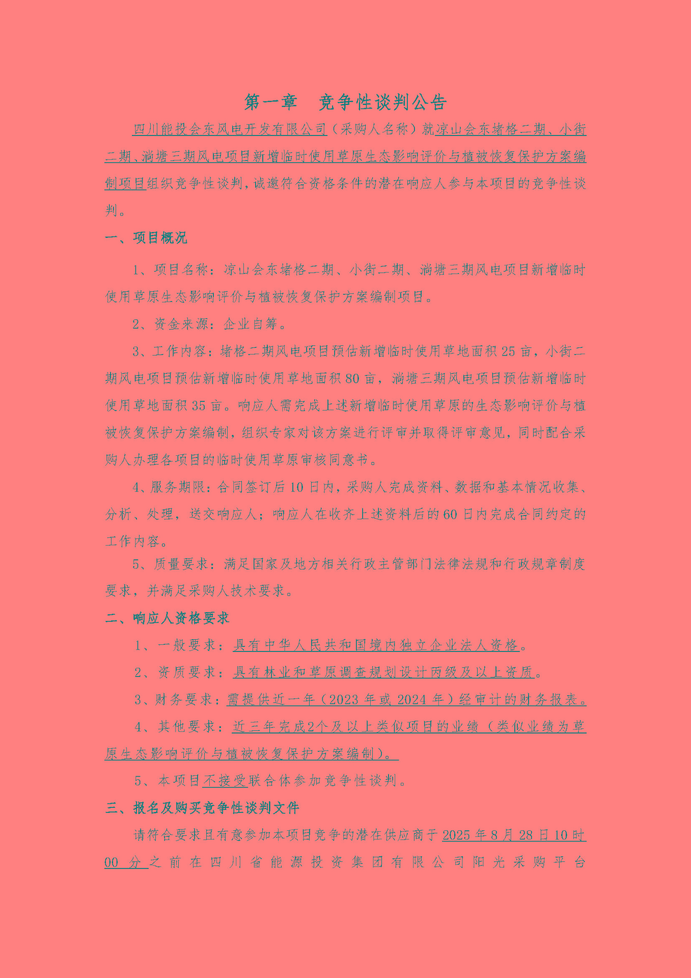 四川能投会东风电开发有限公司(采购人名称)就凉山会东堵格二期、小街二期、淌塘三期风电项目新增临时使用草原生态影响评价与植被恢复保护方案编制项目组织竞争性谈判,诚邀符合资格条件的潜在响应人参与本项目的竞争性谈判。