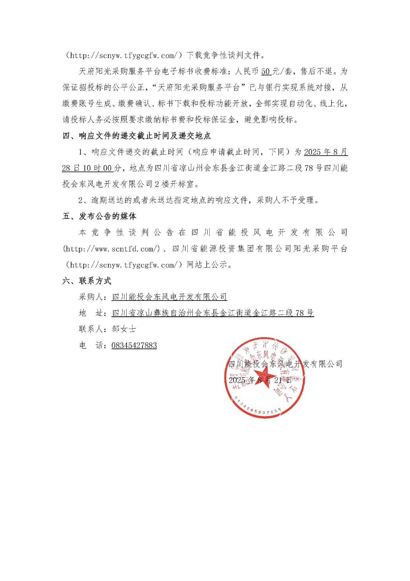 1、响应文件递交的截止时间(响应申请截止时间,下同)为2025年8月28日10时00分,地点为四川省凉山州会东县金江街道金江路二段78号四川能投会东风电开发有限公司2楼开标室。