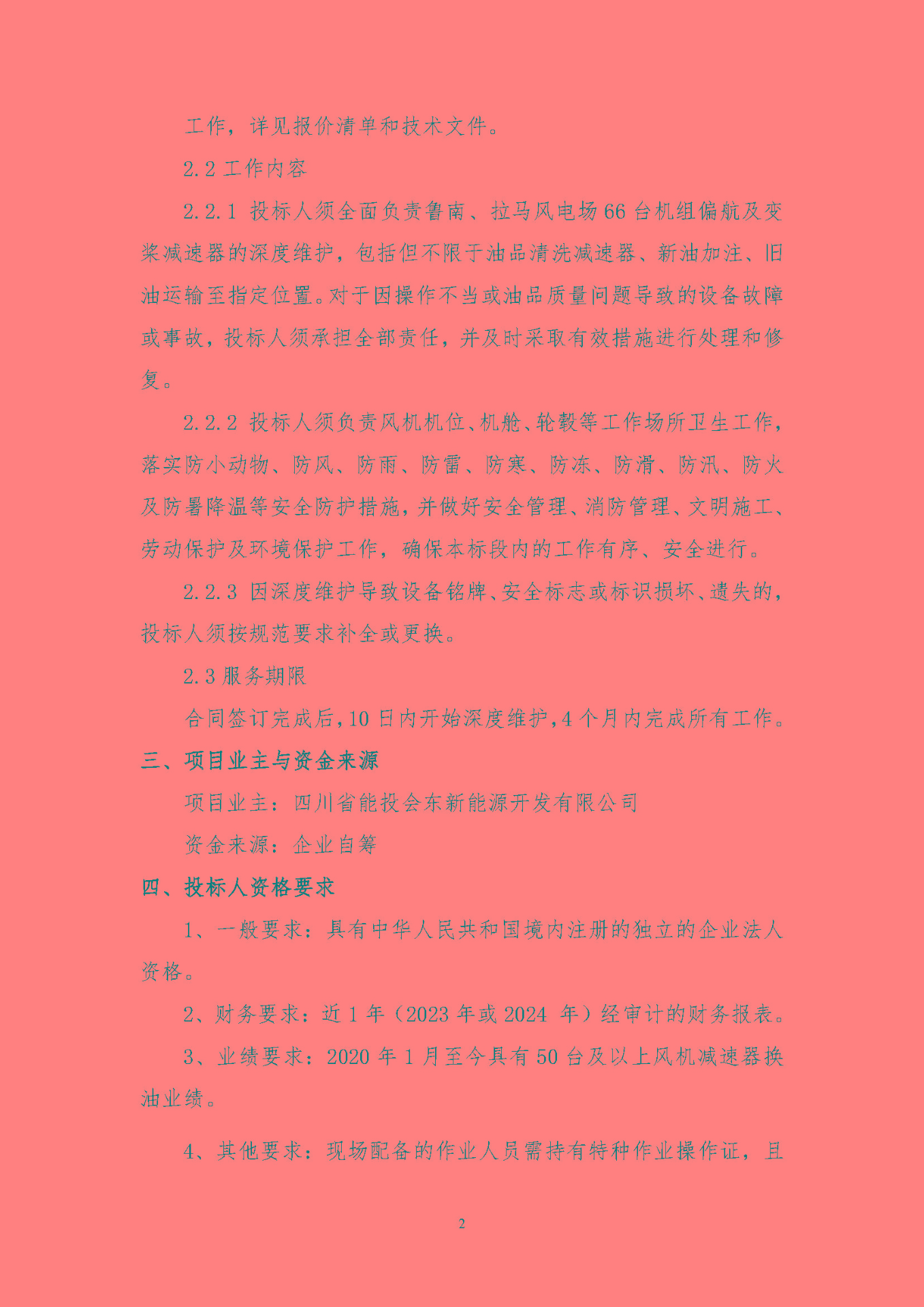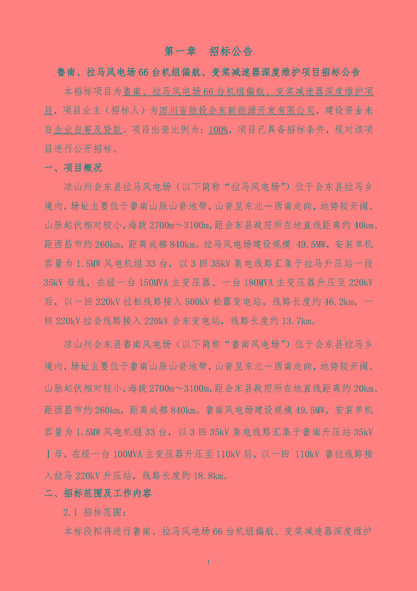 本招标项目为鲁南、拉马风电场66台机组偏航、变桨减速器深度维护项目,项目业主(招标人)为四川省能投会东新能源开发有限公司,建设资金来自企业自筹及贷款。项目出资比例为:100%,项目已具备招标条件,现对该项目进行公开招标。